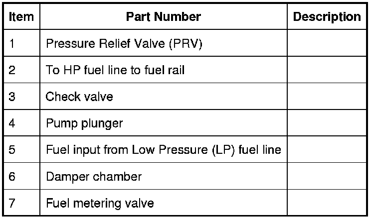The PRV protects the HP side of the system from excessive pressure if there is a failure of the fuel metering valve. If the pump delivery pressure increases to 195 - 204 bar (2828 - 2959 lbf/in2), the PRV opens and returns fuel to the inlet side of the plunger.