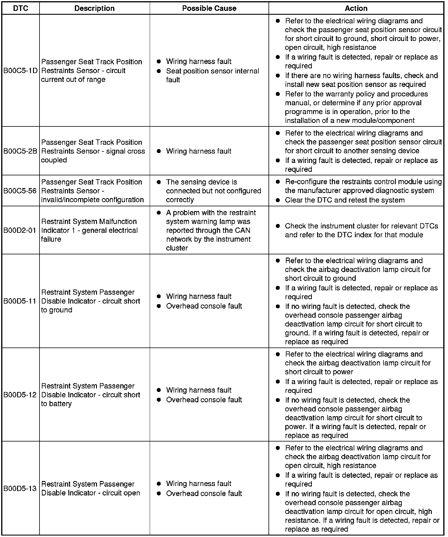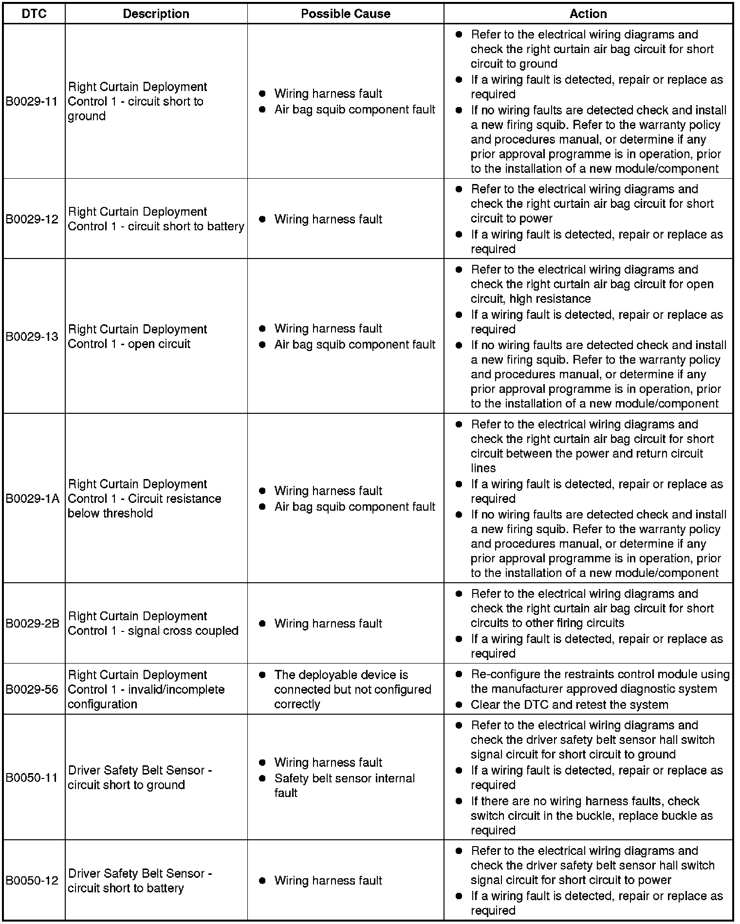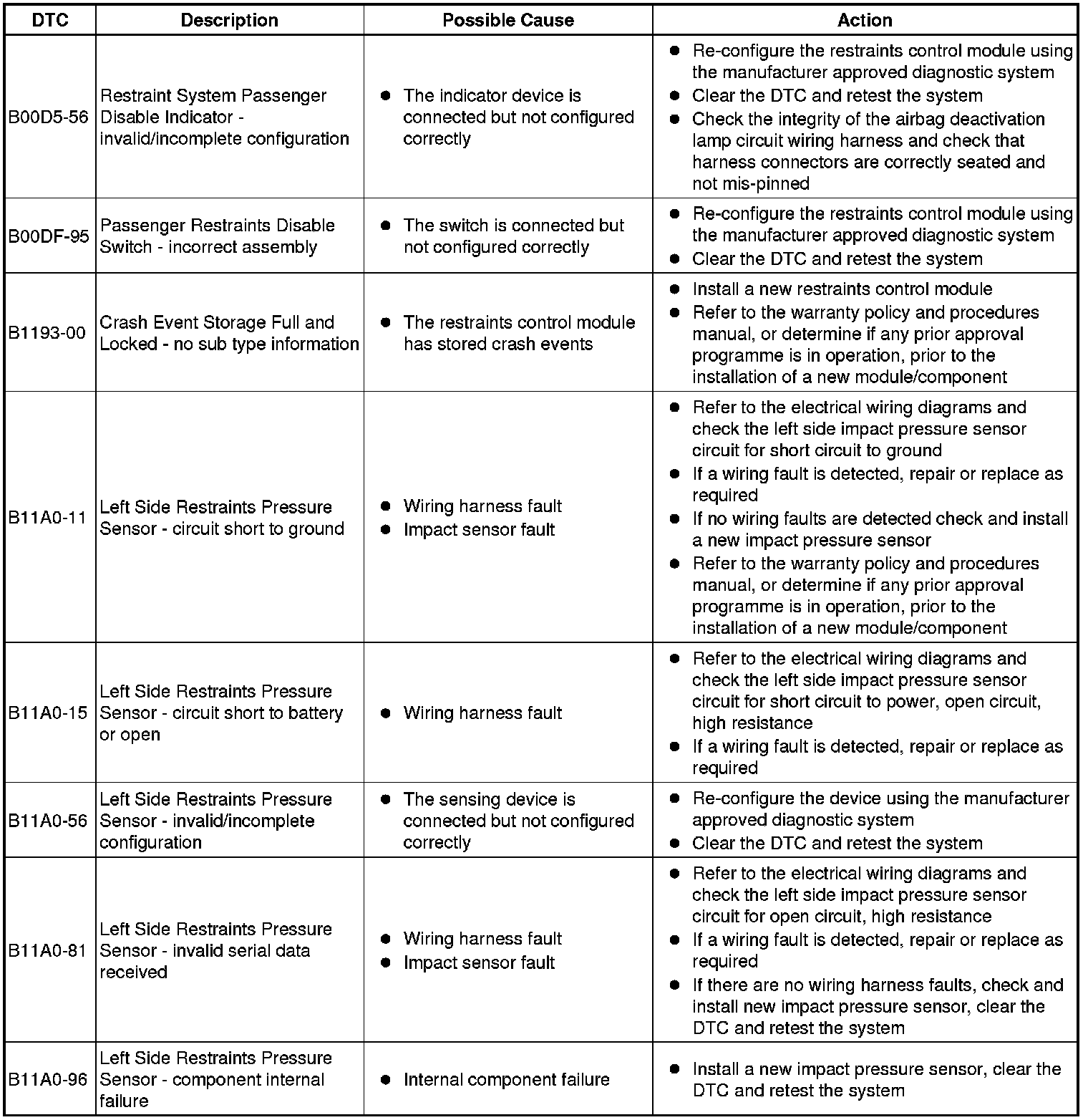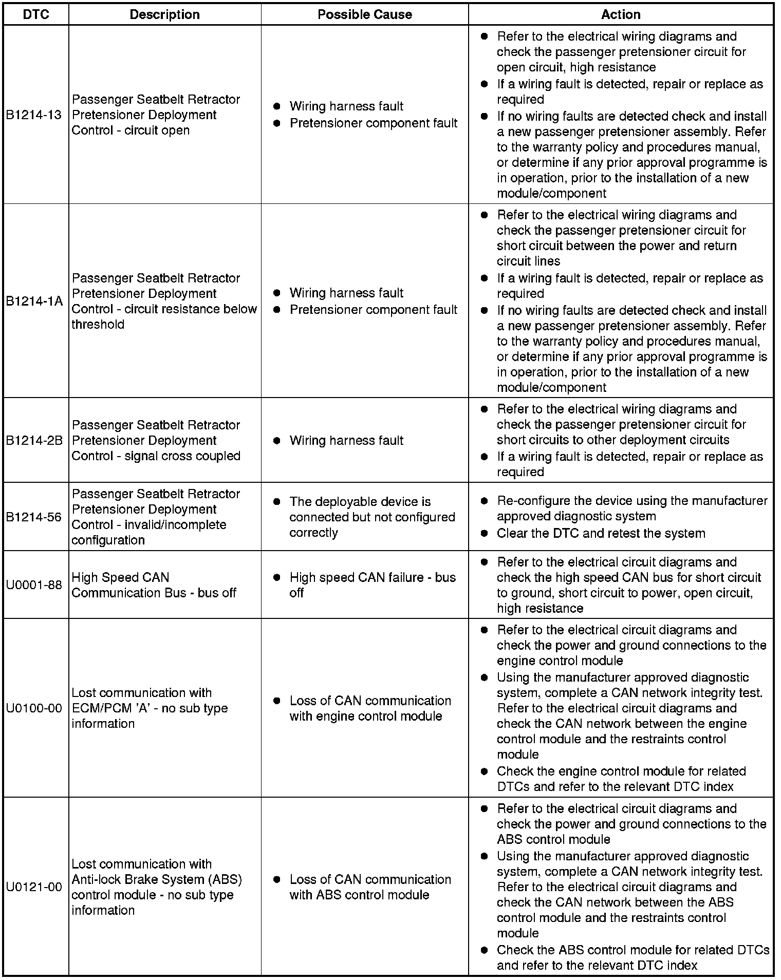The table below lists all diagnostic trouble codes (DTCs) that could be logged in the restraints control module, for additional diagnosis and testing information refer to the relevant diagnosis and testing section. For additional information, refer to Air Bag Systems Initial Inspection and Diagnostic Overview