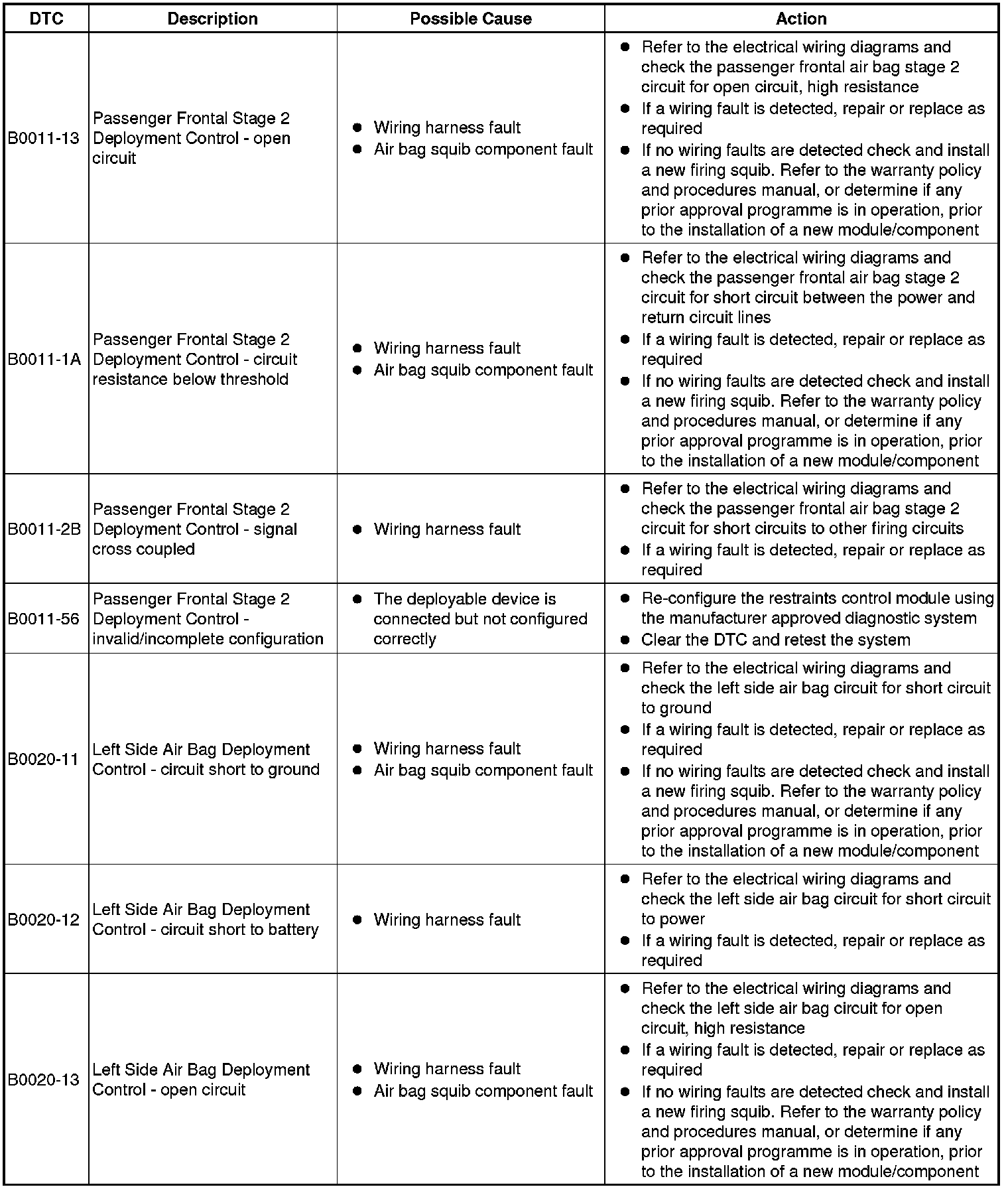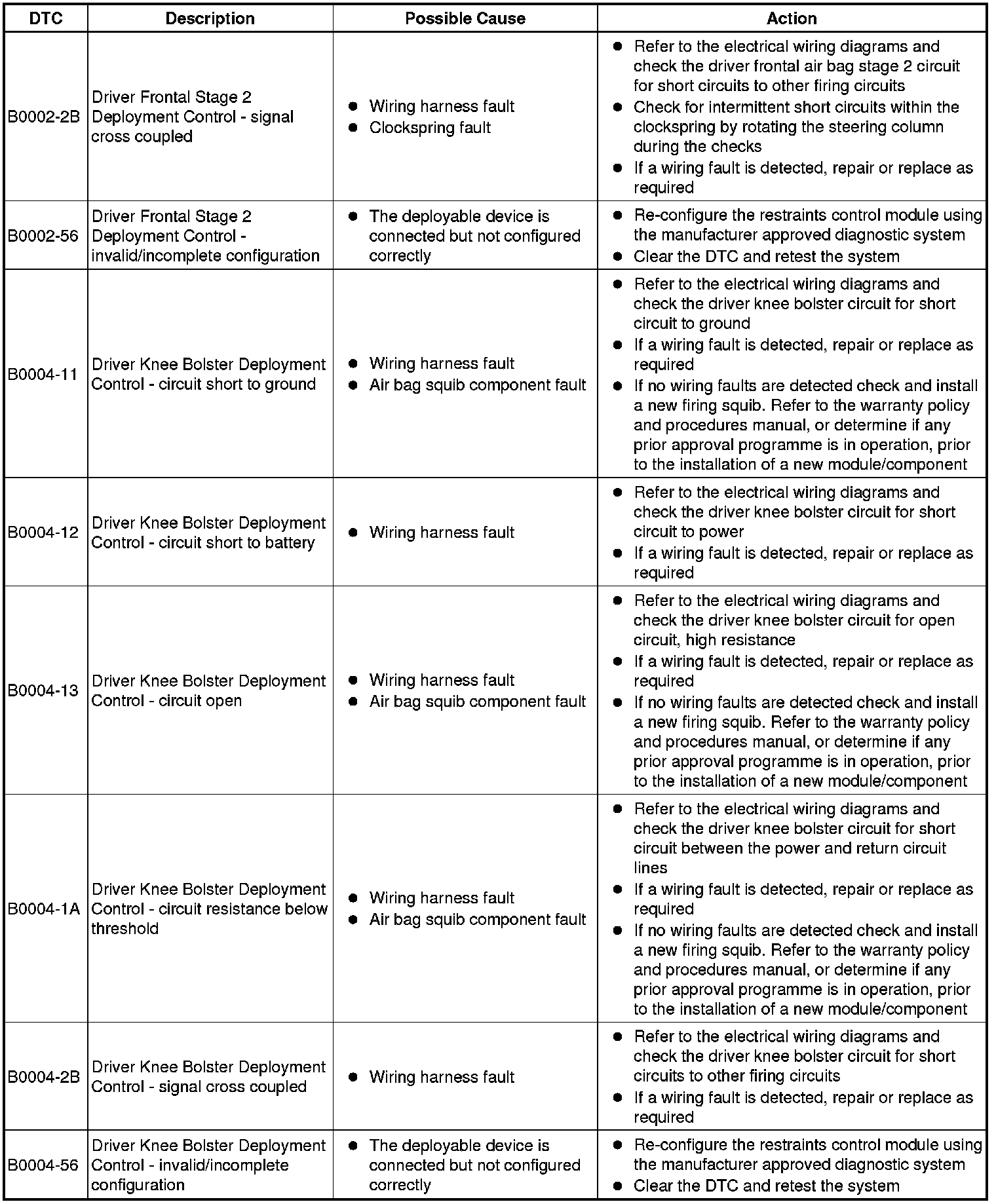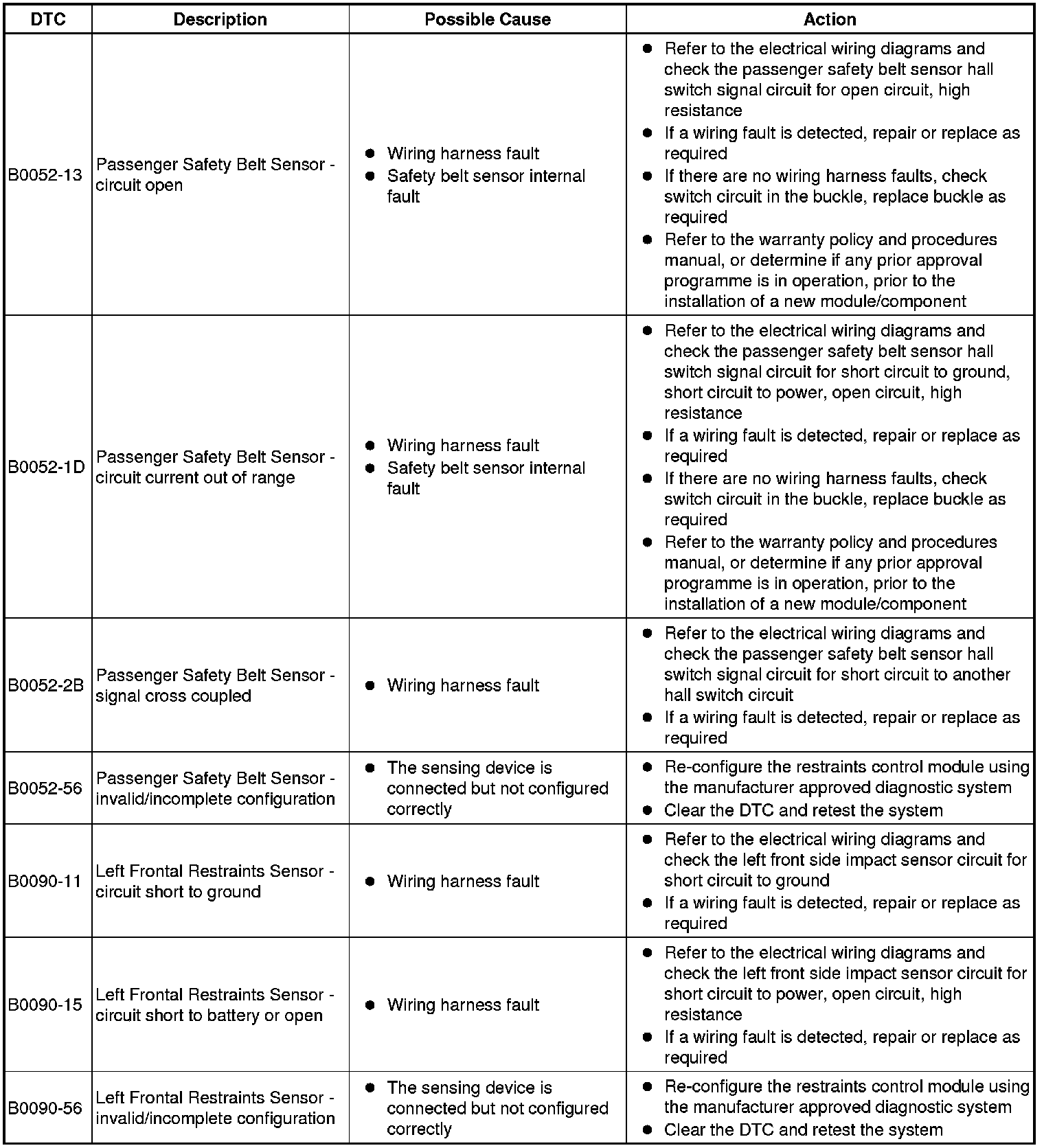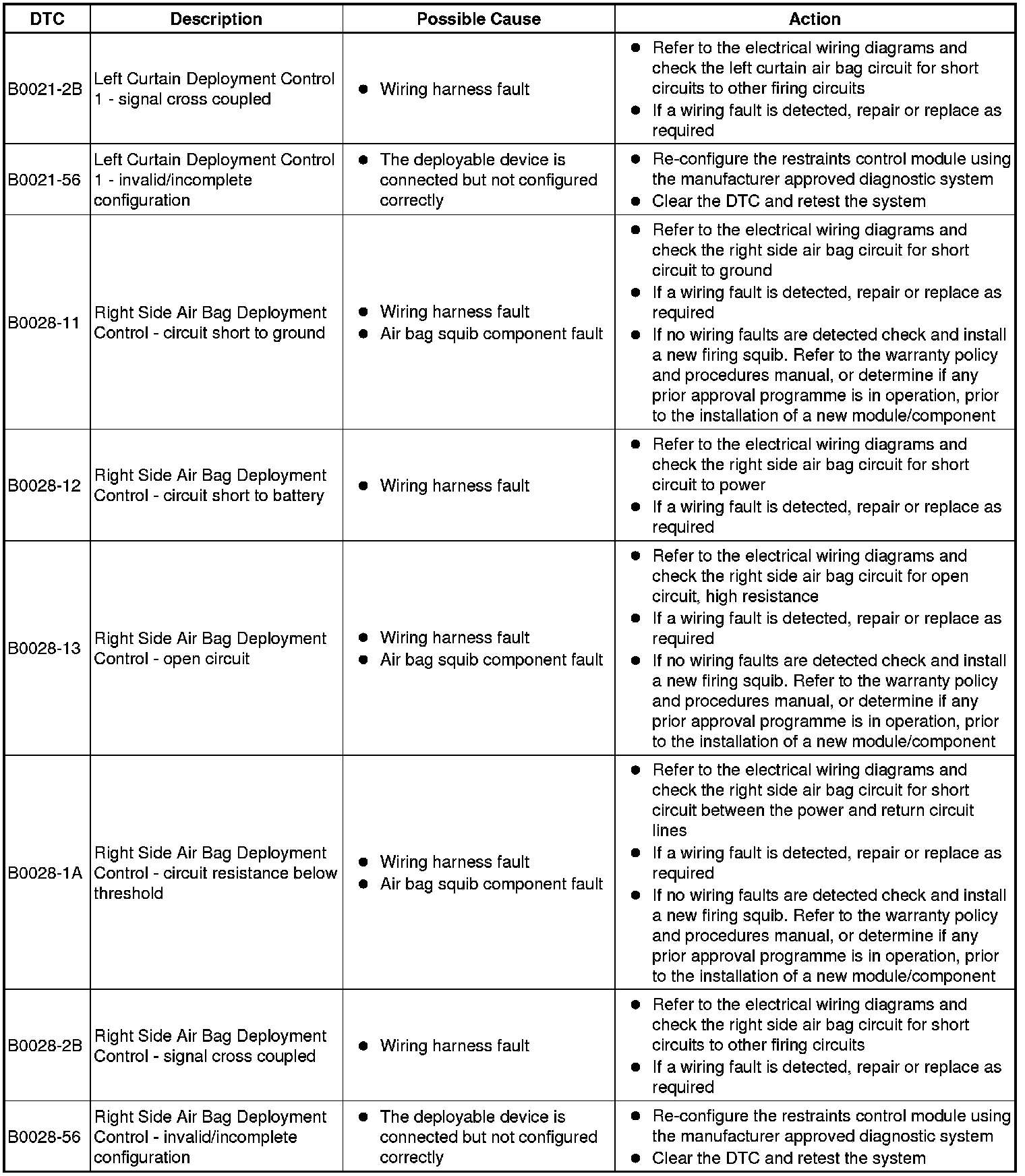 The table below lists all diagnostic trouble codes (DTCs) that could be logged in the restraints control module, for additional diagnosis and testing information refer to the relevant diagnosis and testing section. For additional information, refer to Air Bag Systems Initial Inspection and Diagnostic Overview