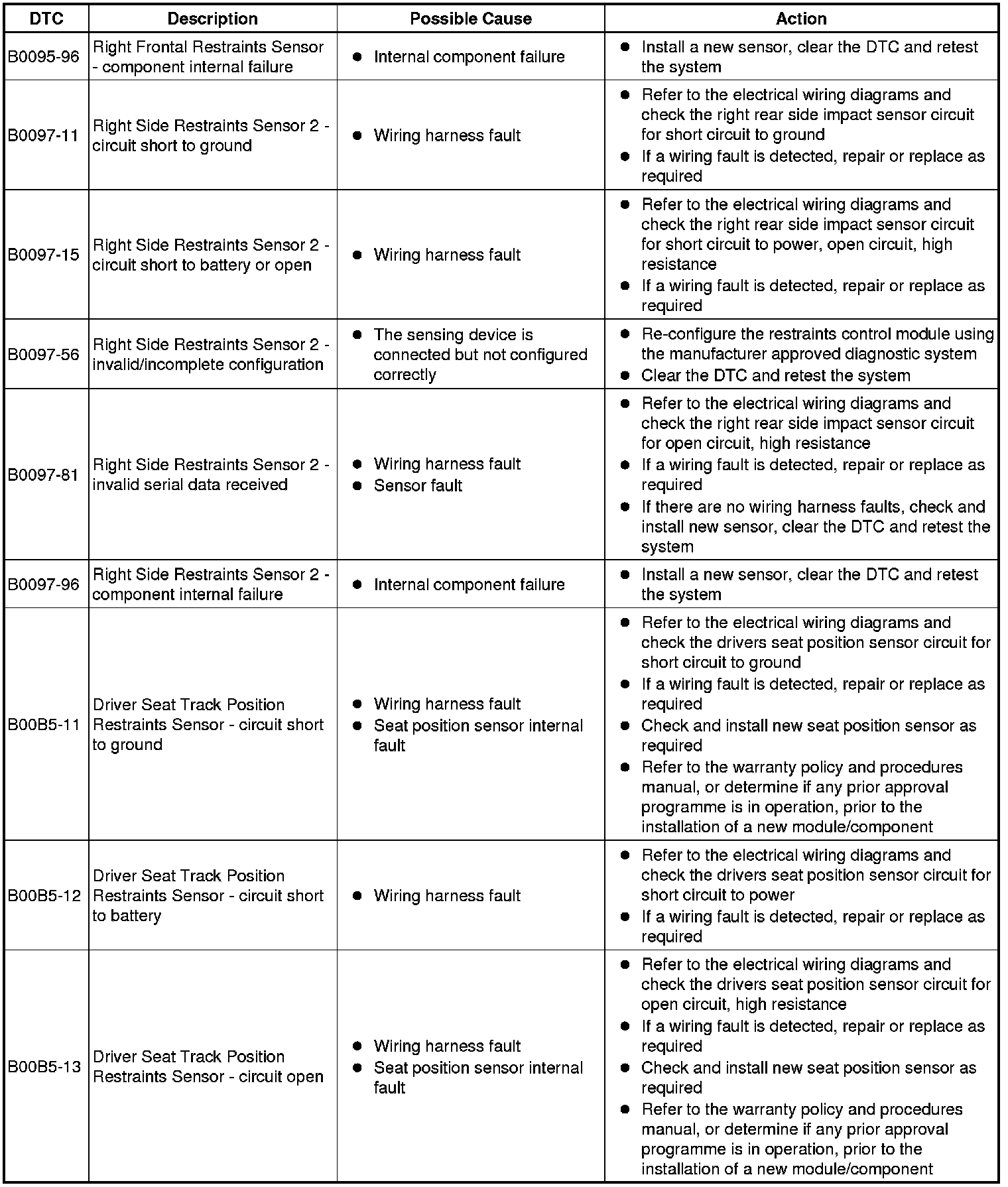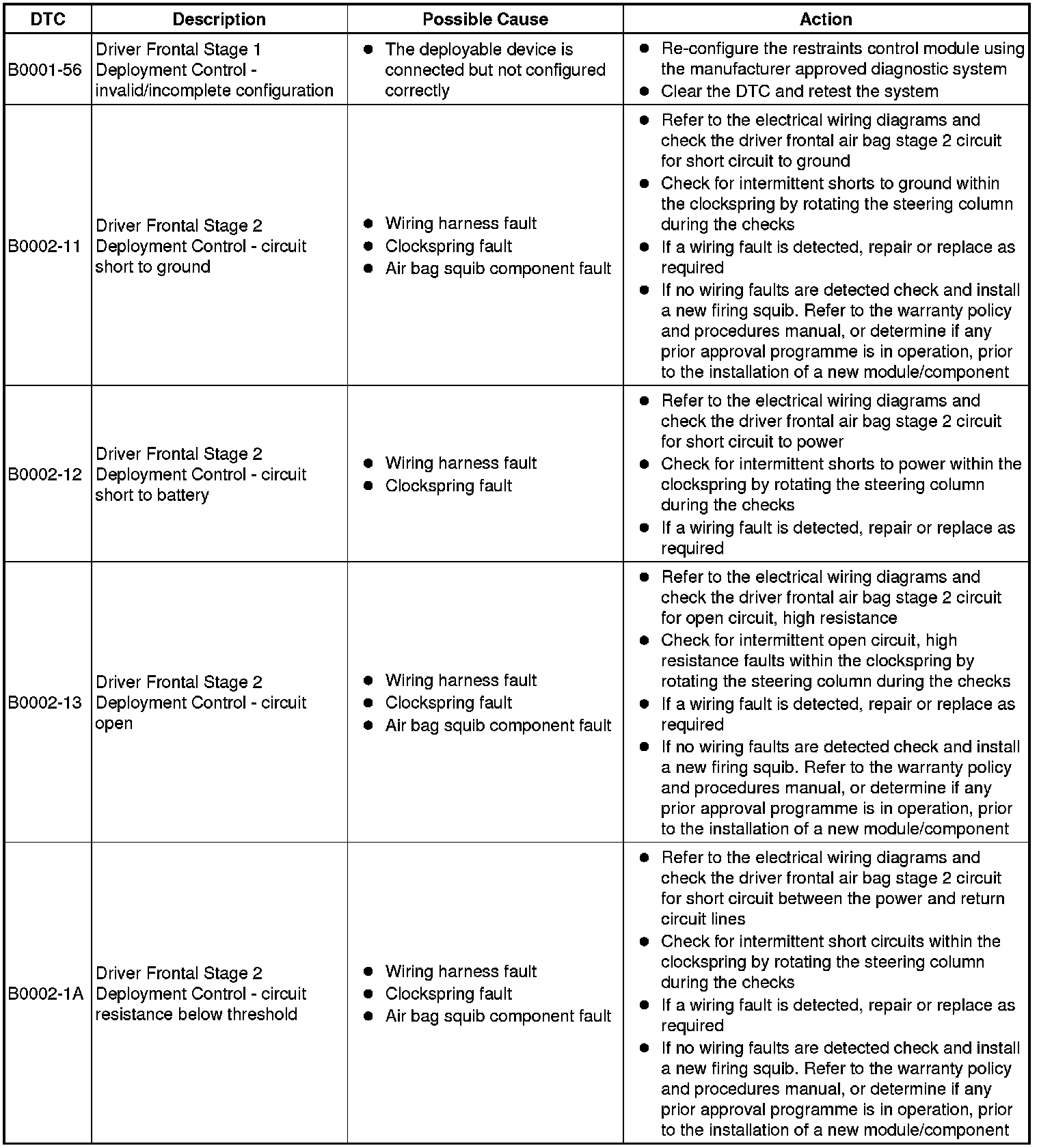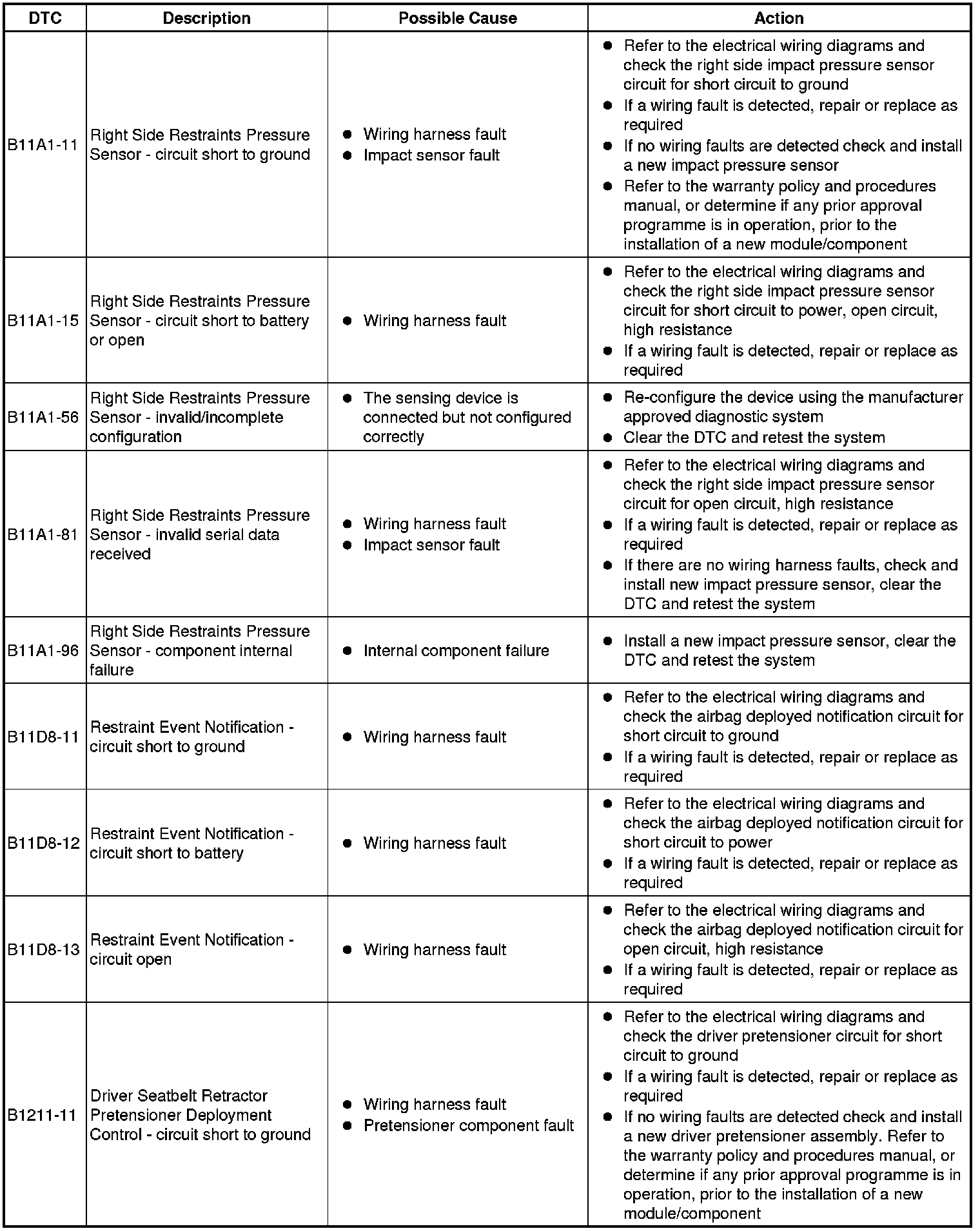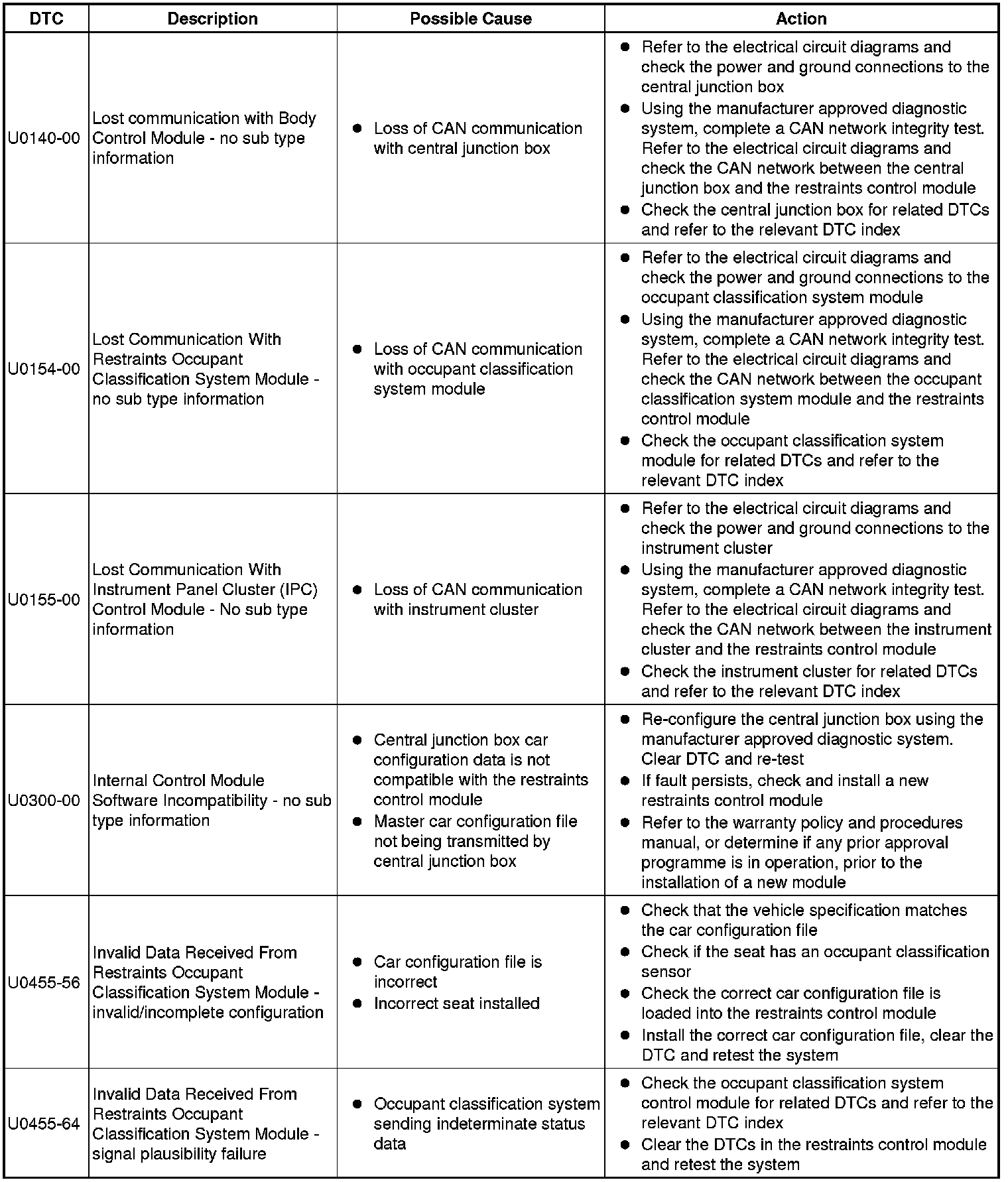 The table below lists all diagnostic trouble codes (DTCs) that could be logged in the restraints control module, for additional diagnosis and testing information refer to the relevant diagnosis and testing section. For additional information, refer to Air Bag Systems Initial Inspection and Diagnostic Overview