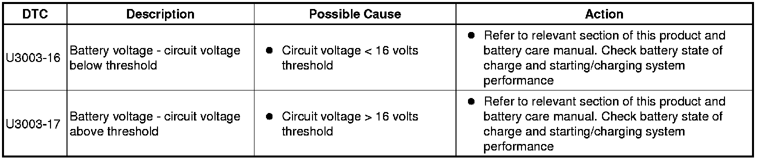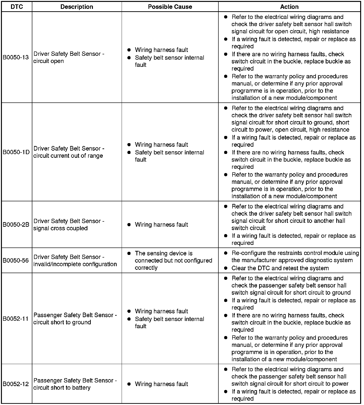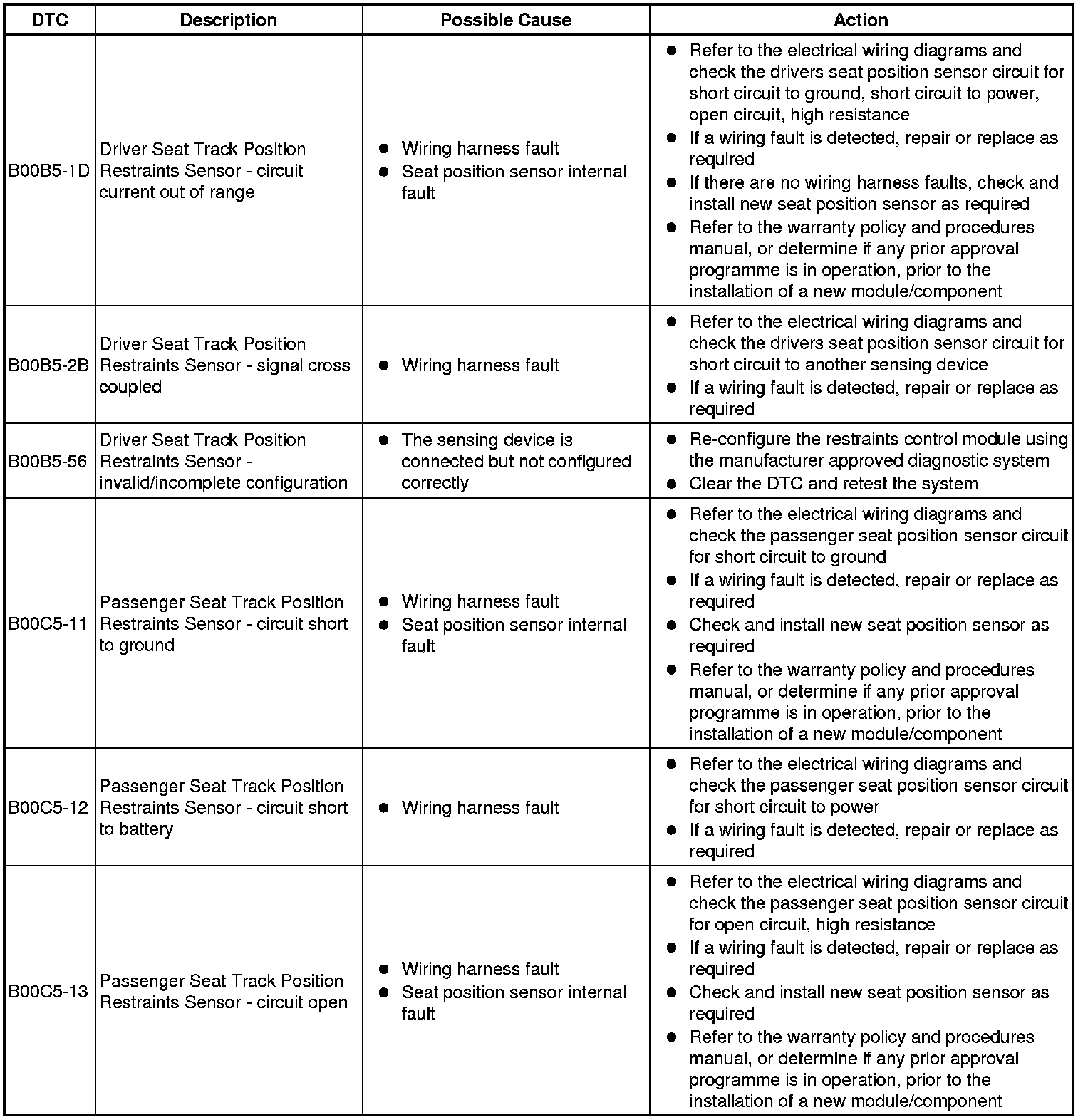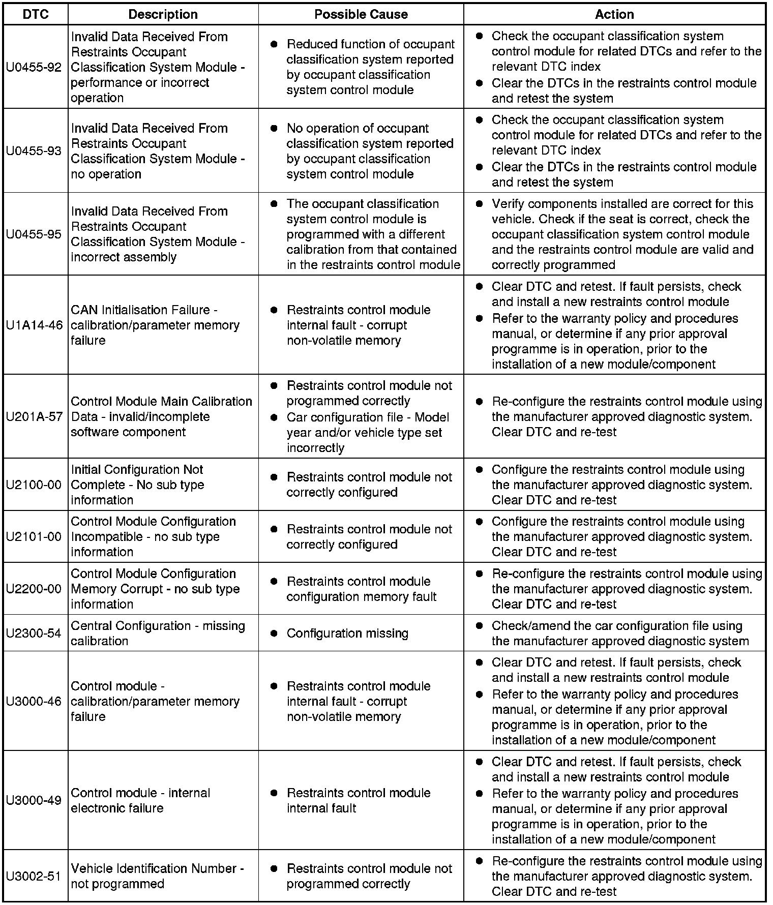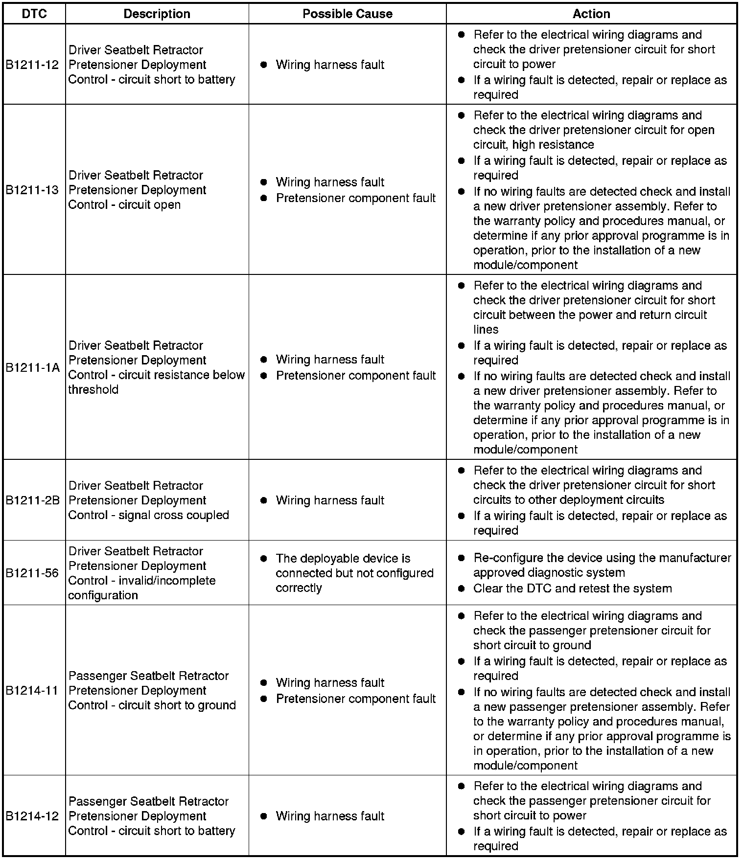 The table below lists all diagnostic trouble codes (DTCs) that could be logged in the restraints control module, for additional diagnosis and testing information refer to the relevant diagnosis and testing section. For additional information, refer to Air Bag Systems Initial Inspection and Diagnostic Overview