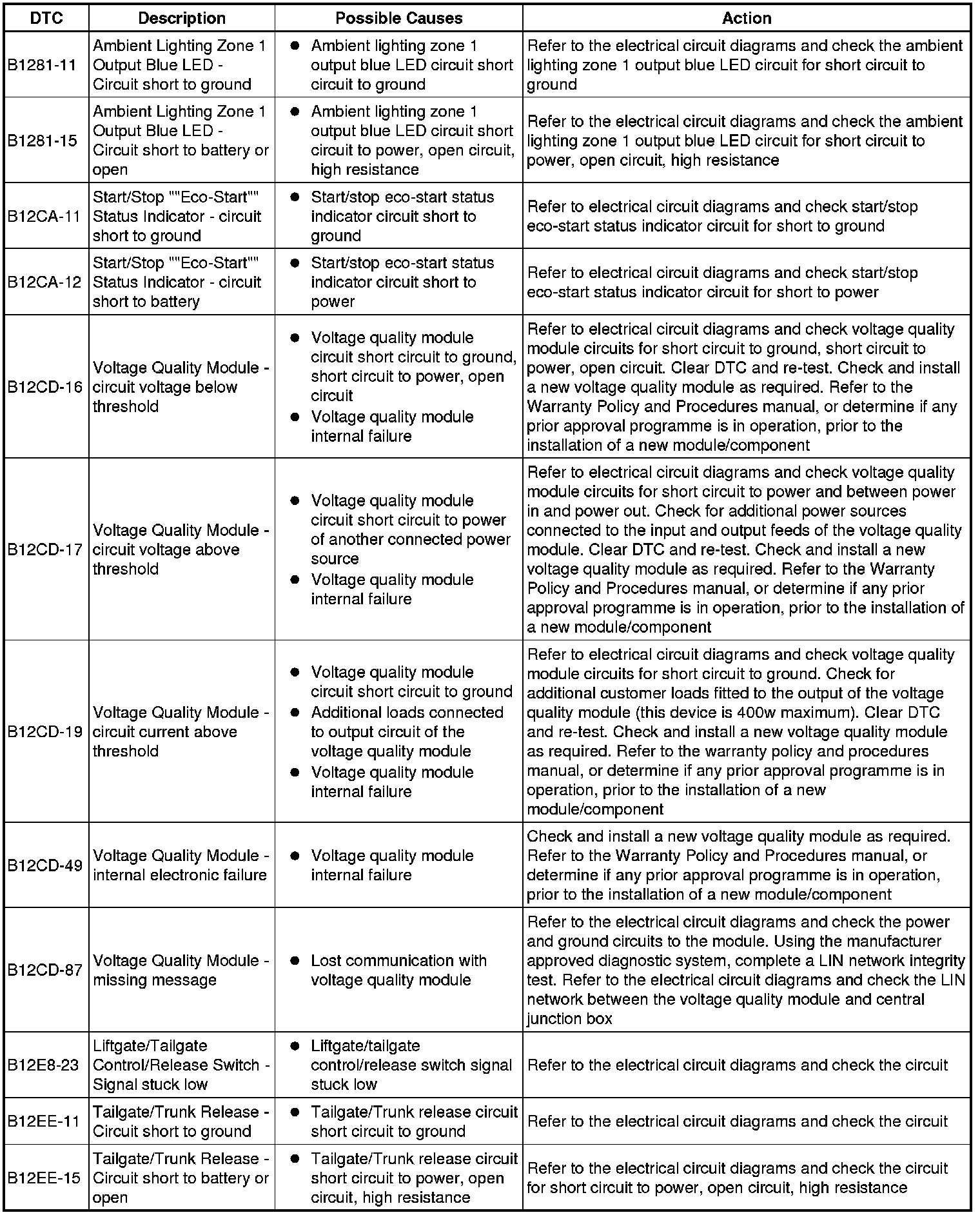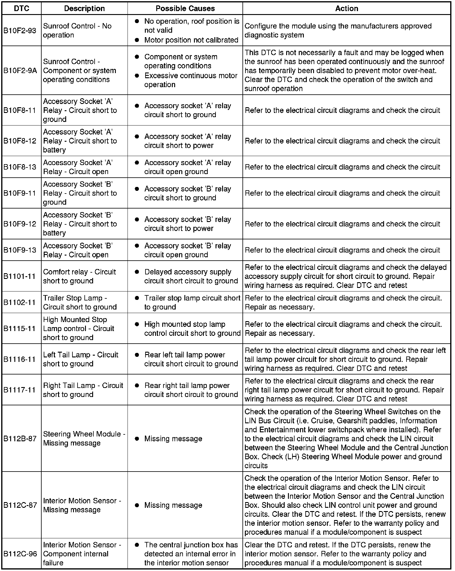 The table below lists all diagnostic trouble codes (DTCs) that could be logged in the central junction box, for additional information refer to the relevant Description and Operation section. For additional information, refer to Communications Network Overview