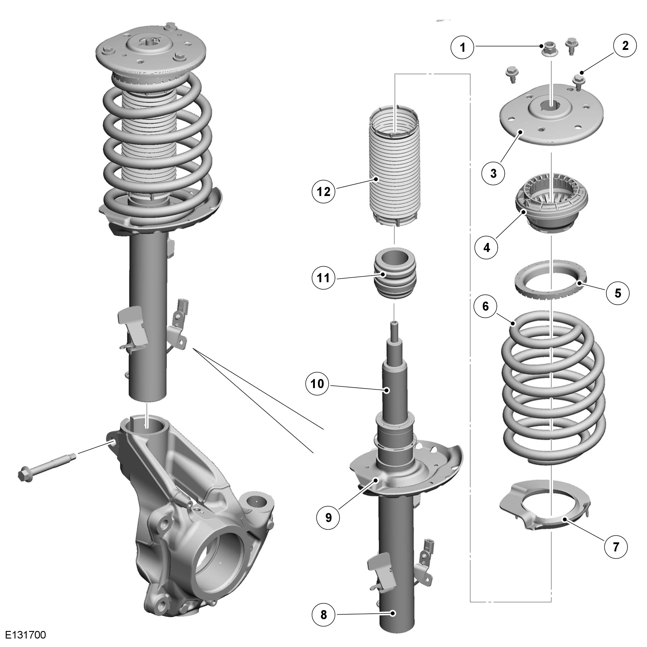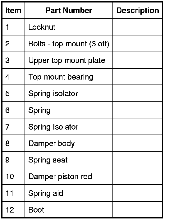 The spring and damper assembly consists of a damper with a coil spring located on a welded spring seat on the damper tube. The lower end of the damper body locates in the wheel knuckle and is clamped with a nut and bolt.