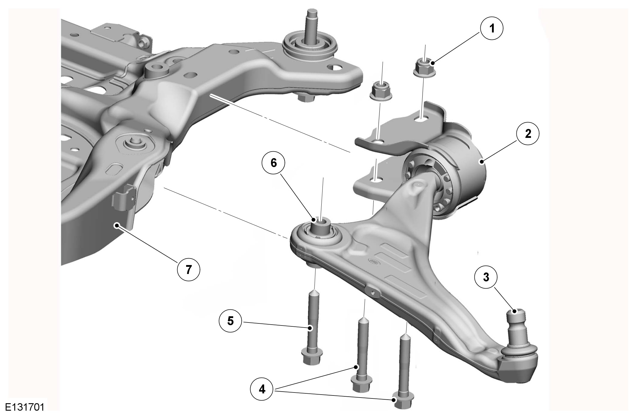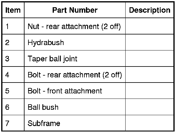 Two inner attachments locate the inner end of the lower control arm in the subframe. The forward attachment is a non-serviceable rubber bush which is pressed into the control arm. This joint locates in a slot in the subframe and is secured with a bolt which is screwed into a threaded boss on the subframe.