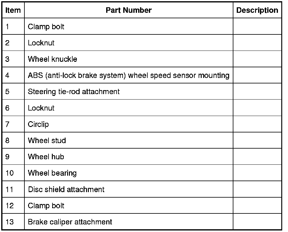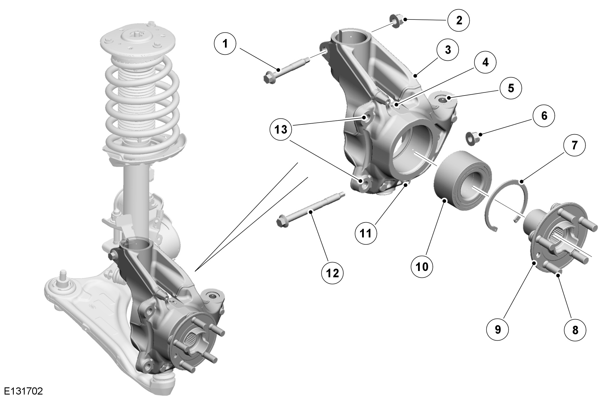 Mounting locations are provided for the brake caliper and the brake disc shield. A hole in the top face of the wheel knuckle provides the location for the ABS (anti-lock brake system) wheel speed sensor, which is secured with a bolt.