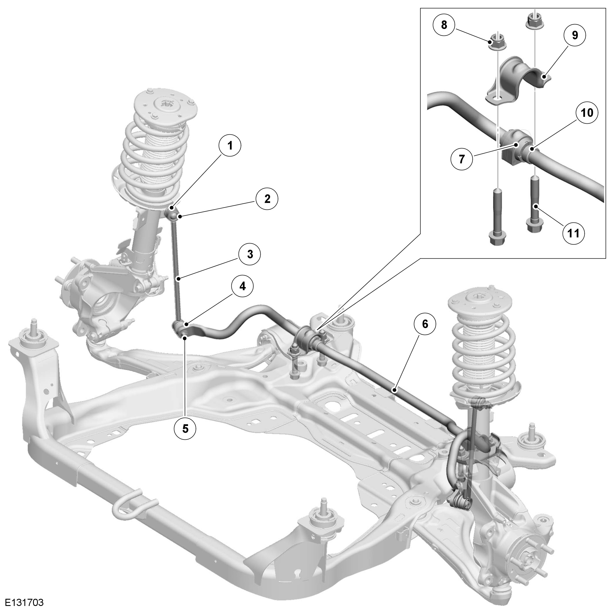 The stabilizer bar bushes are the compression type which grip the bar under compression by the mounting brackets. When fitting replacement bushes, it is important to ensure the bushes have the correct color code and are correctly orientated to the bar. Failure to correctly align the bushes will result in excessive pre-load (wind-up) in the bushes when the suspension is at its nominal ride height.