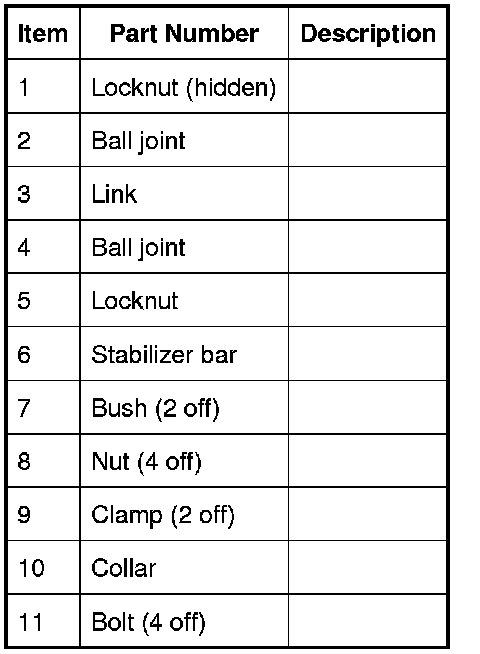 Each end of the stabilizer bar curves forwards to attach to a ball joint on a stabilizer link. Each stabilizer link is secured to a bracket on the damper body with a locknut. The links, which are not handed, allow the stabilizer bar to move with the wheel travel.