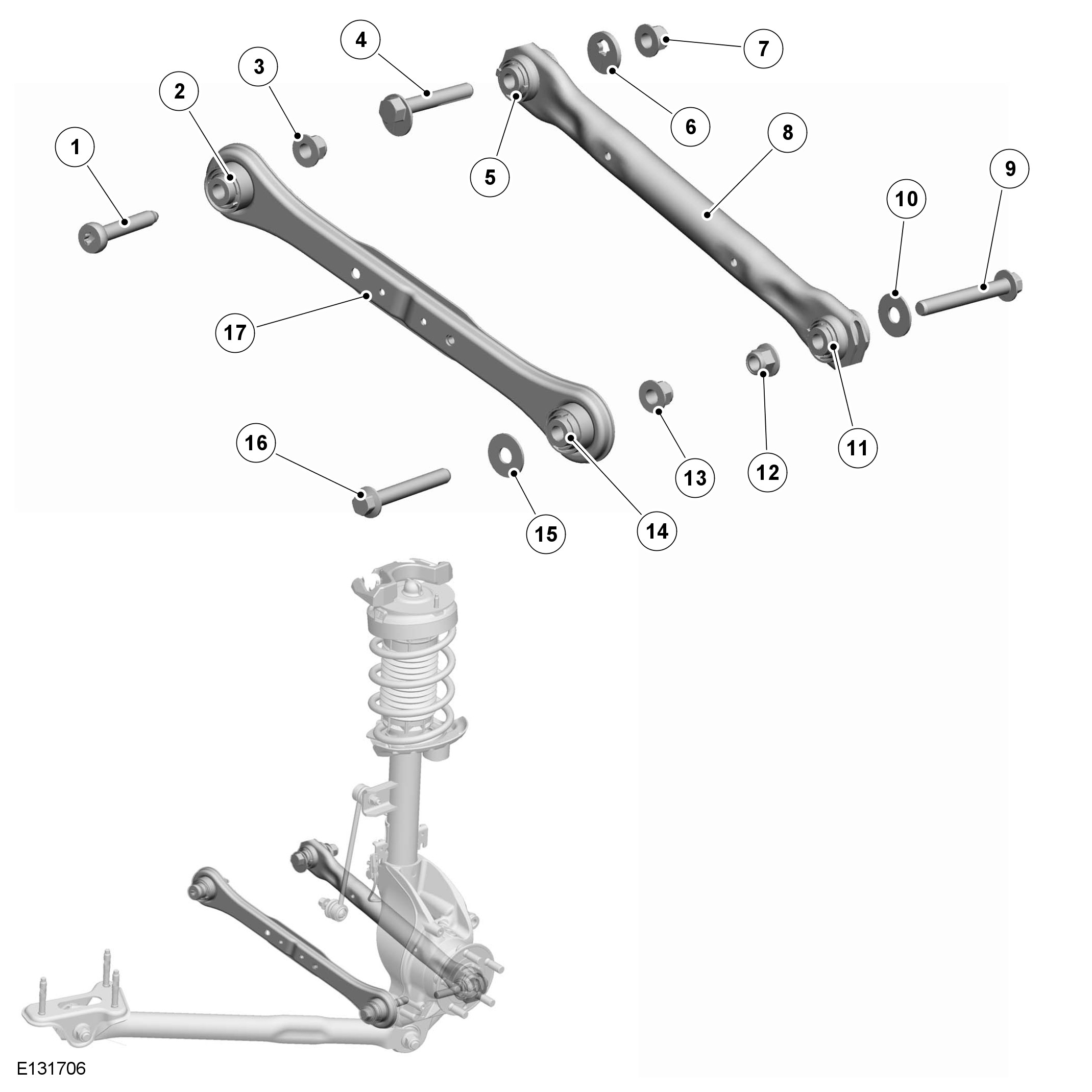 Both transverse links are attached to the subframe with bolts and locknuts. The outer ends of each link locate in mounting holes integral with the wheel knuckle and are secured with bolts and locknuts.