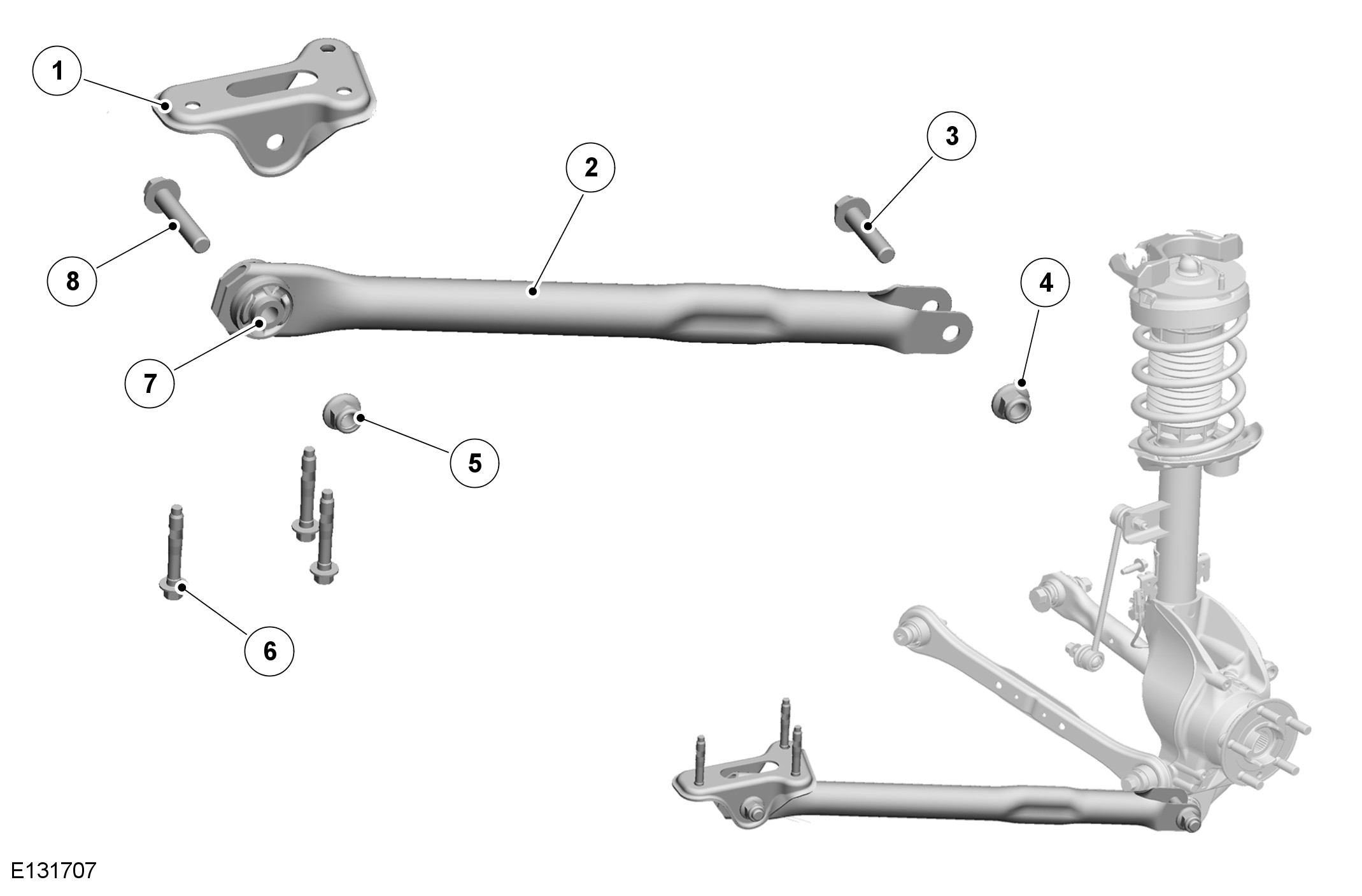 The rear transverse link is mounted to the subframe using an eccentric bolt and washer which allows for adjustment of the wheel toe angle.