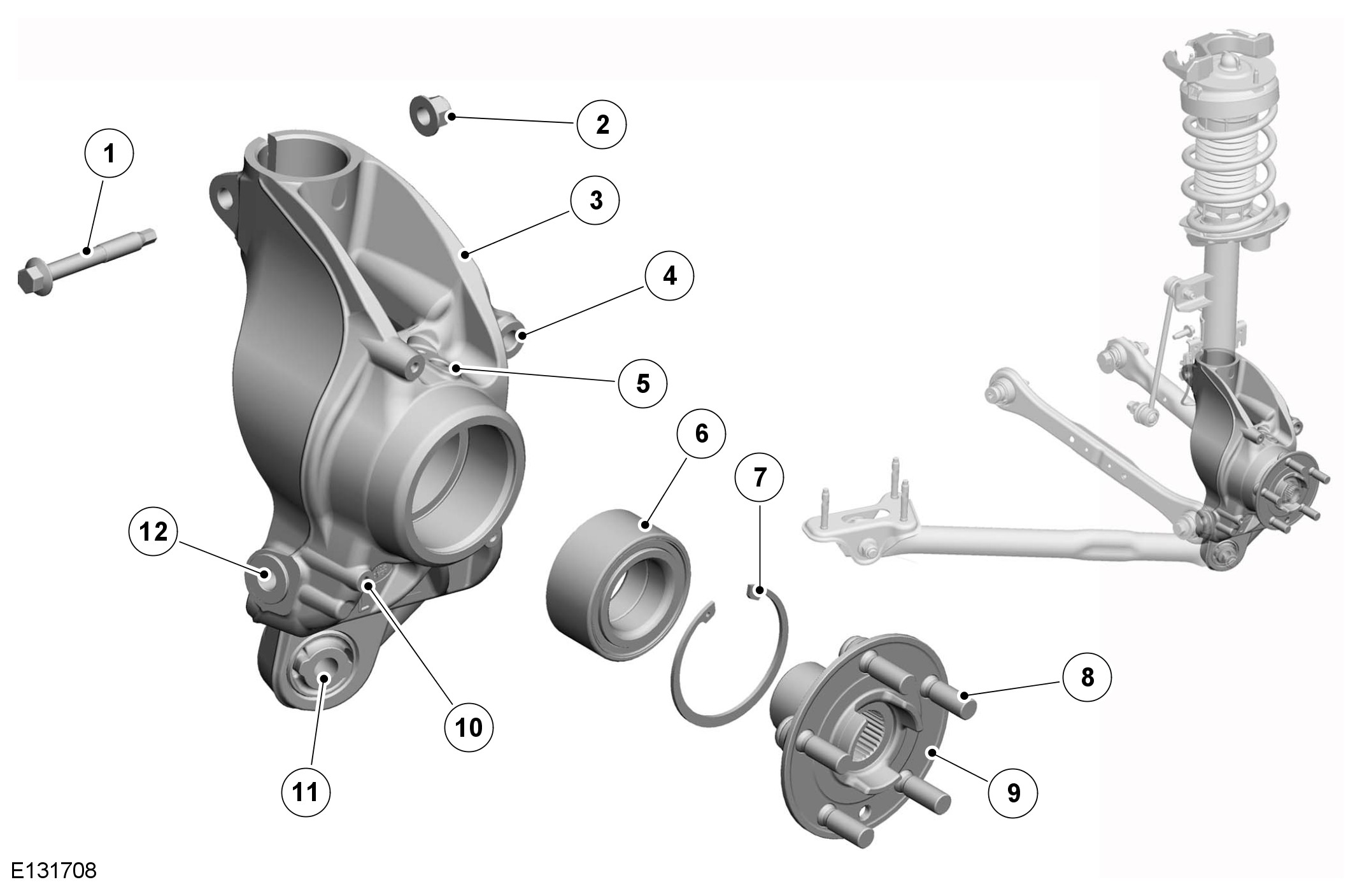 The cast steel wheel knuckle provides the attachment for the transverse links, longitudinal link, spring and damper assembly and the wheel hub and bearing assembly.