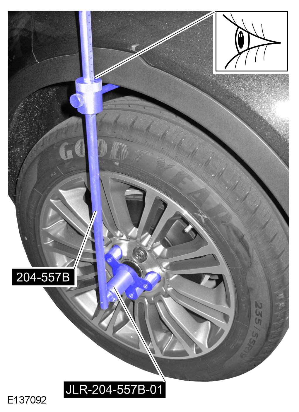 - With the diagnostic tool in the suspension height measurement screen, use the special tool to measure and record the height setting from each wheel center to the wheel arch.