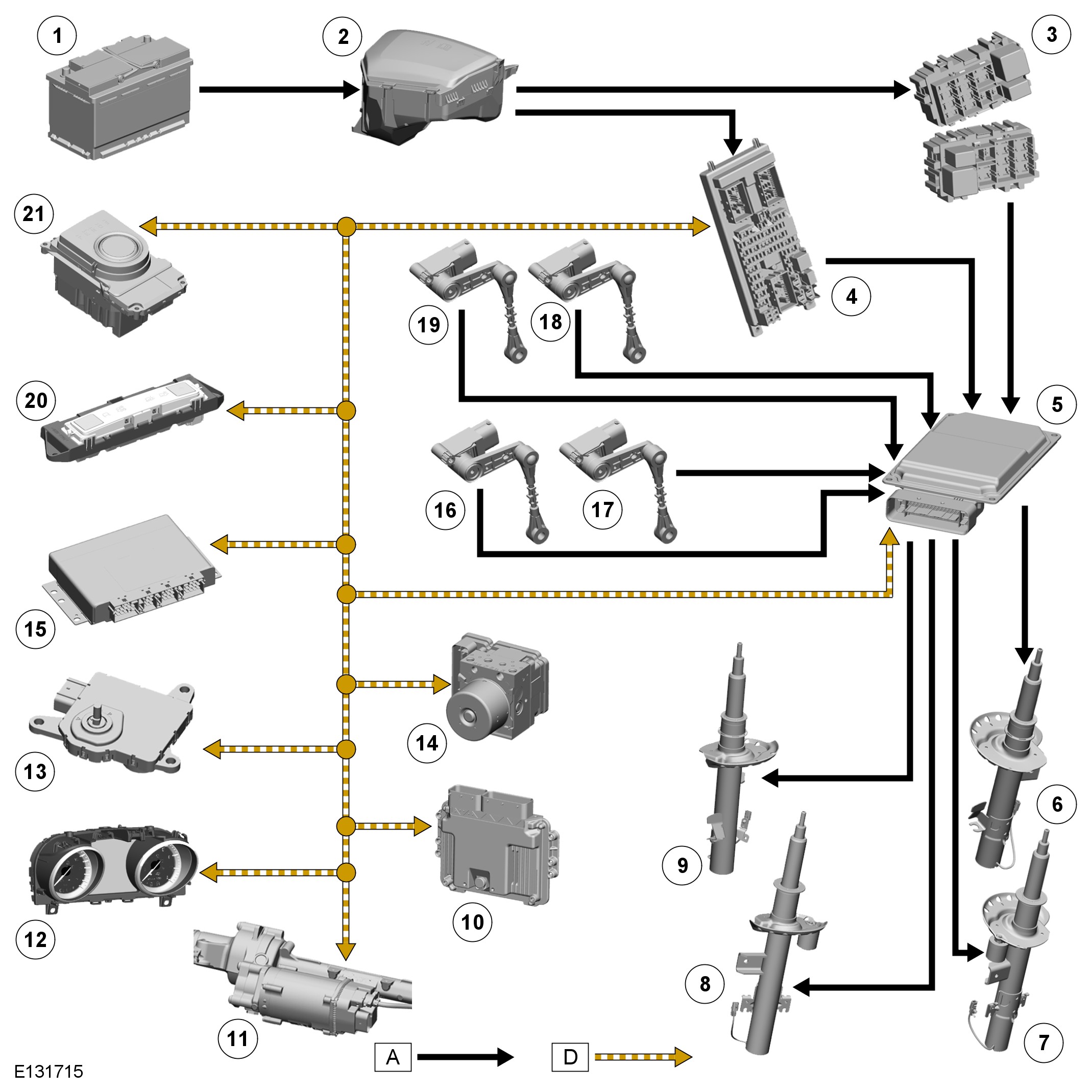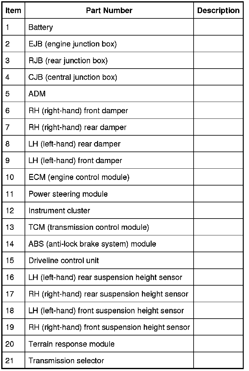 If a fault is detected by the ADM, a message is sent via the high speed CAN (controller area network) to the instrument cluster, which illuminates the yellow general warning indicator and displays the message Adaptive Dynamics Fault. The ADM also logs an appropriate DTC (diagnostic trouble code). The ADM can be interrogated using a Land Rover approved diagnostic system.