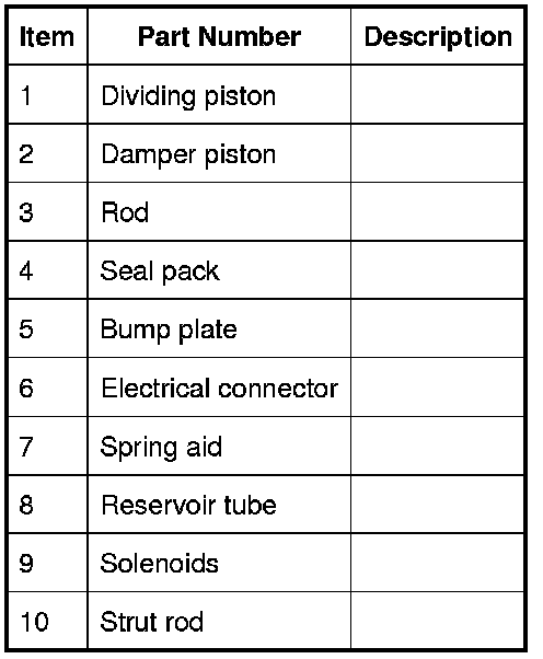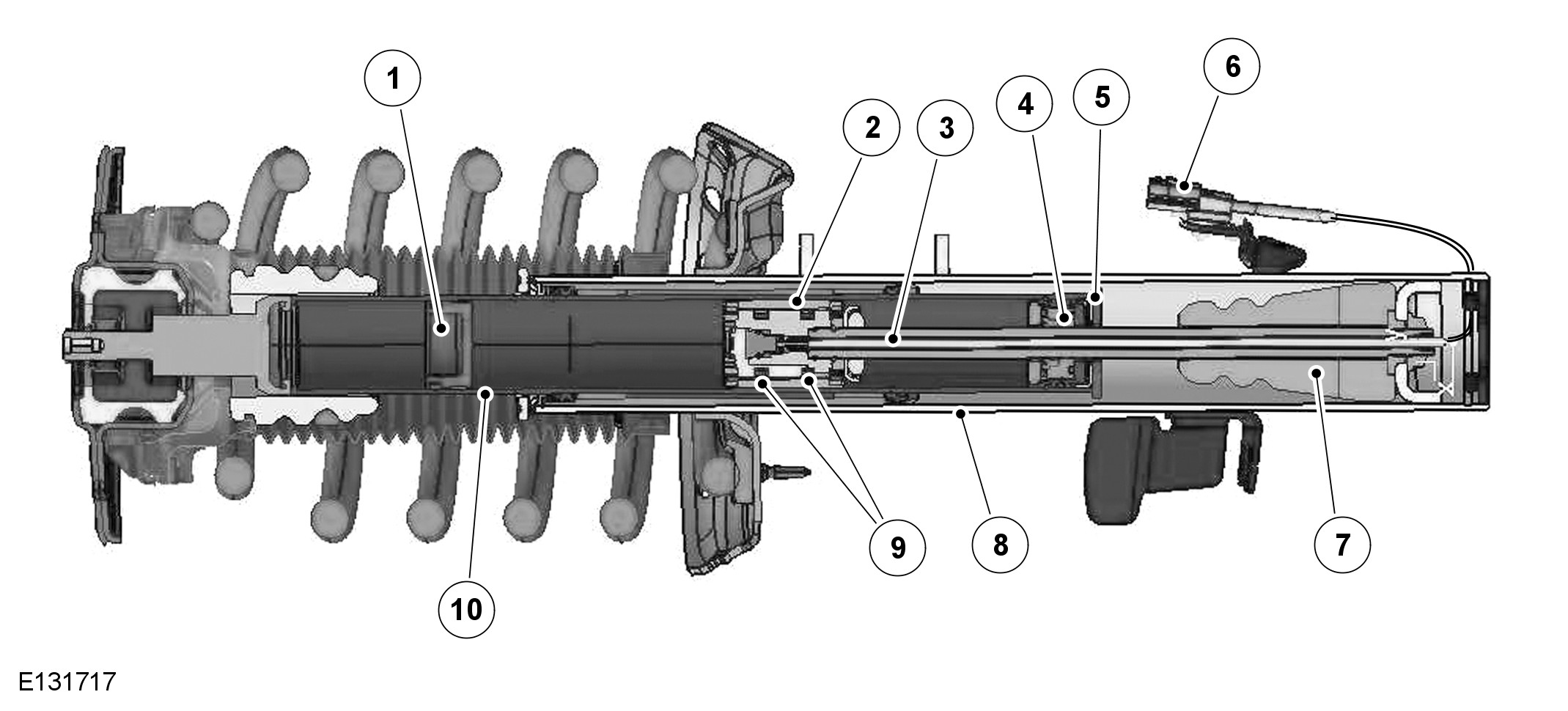 The magnetic field is produced by two coils integrated into the damper piston and connected to the ADM via a fly-lead and an external electrical connector. When energized by the ADM, the coils produce magnetic fields in the RM fluid as it flows through passageways in the damper piston from the high pressure side to the low pressure side. The coils are energized by a 30 kHz PWM (pulse width modulation) signal from the ADM. The ADM continuously varies the signals to independently increase and decrease the damping of each damper as required. The current is varied between 0 A (lowest damping force) and 5 A (highest damping force).