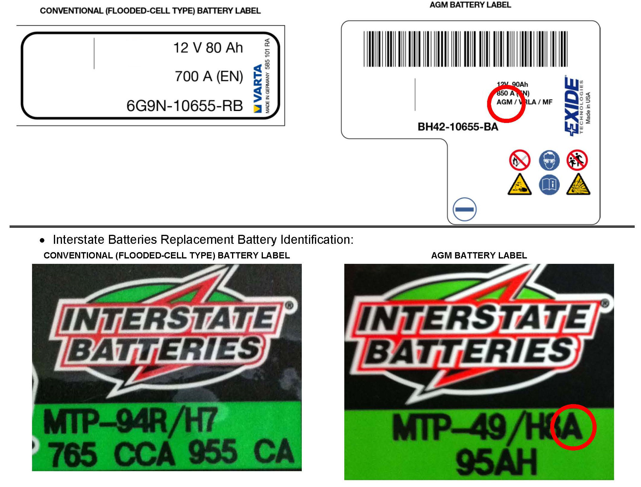 Unless specifically instructed in any Bulletin // Service Action or via a parts supersession, the replacement battery must be the same type as the one removed from the vehicle: Example: if an AGM battery is fitted replace only with an AGM battery; if a flooded battery is fitted replace only with a flooded type battery.