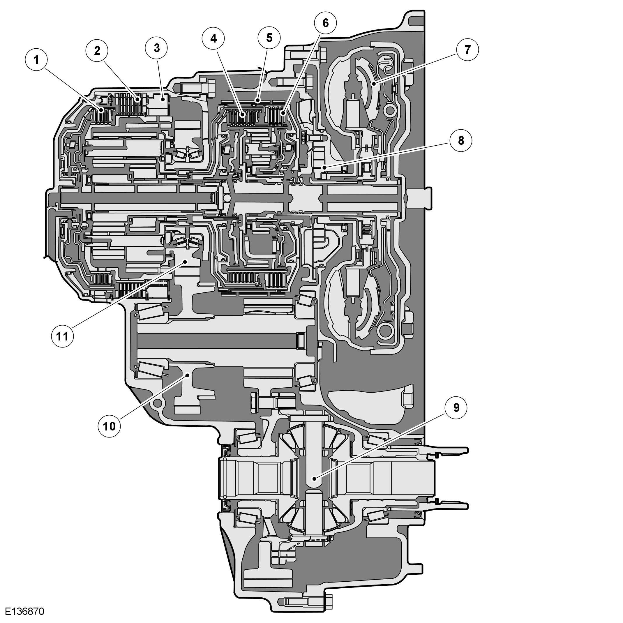 The shift elements (clutches and brakes) are actuated hydraulically. Fluid pressure is applied to the required clutch and/or brake, pressing the plates together and allowing drive to be transmitted through the plates. The purpose of the shift elements is to perform power-on shifts with no interruption to traction and smooth transition between gear ratios.