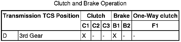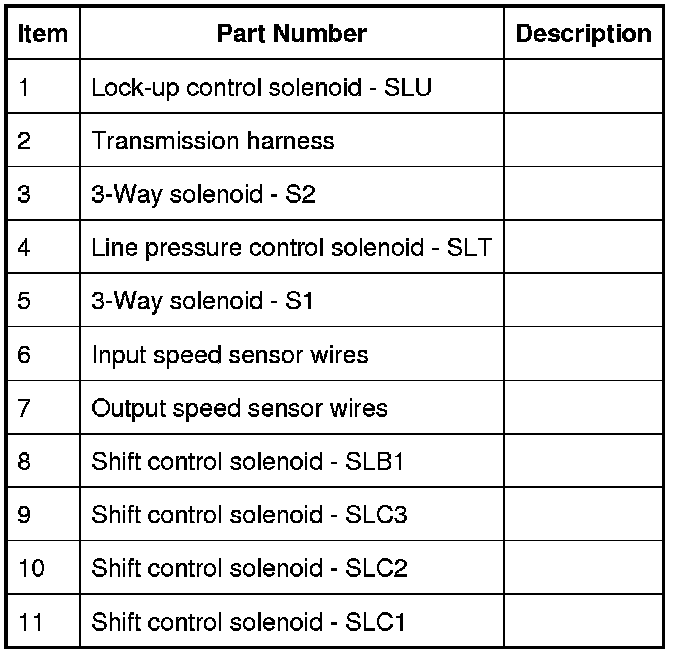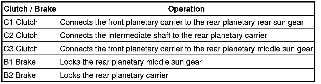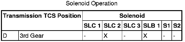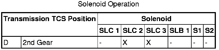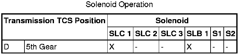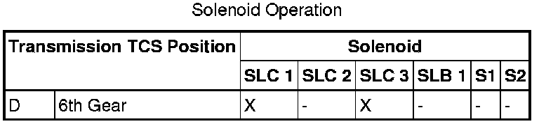 The shift control solenoids (SLC1, SLC2, SLC3 and SLB1) are installed on the front valve body. The solenoids respond to inputs from the TCM (transmission control module) and control the hydraulic pressure applied to the clutches (C1, C2 and C3) and to the brake B1 to provide smooth shifting. The TCM (transmission control module) uses a single or a combination of these solenoids to provide shifts from 1st to 6th gear.