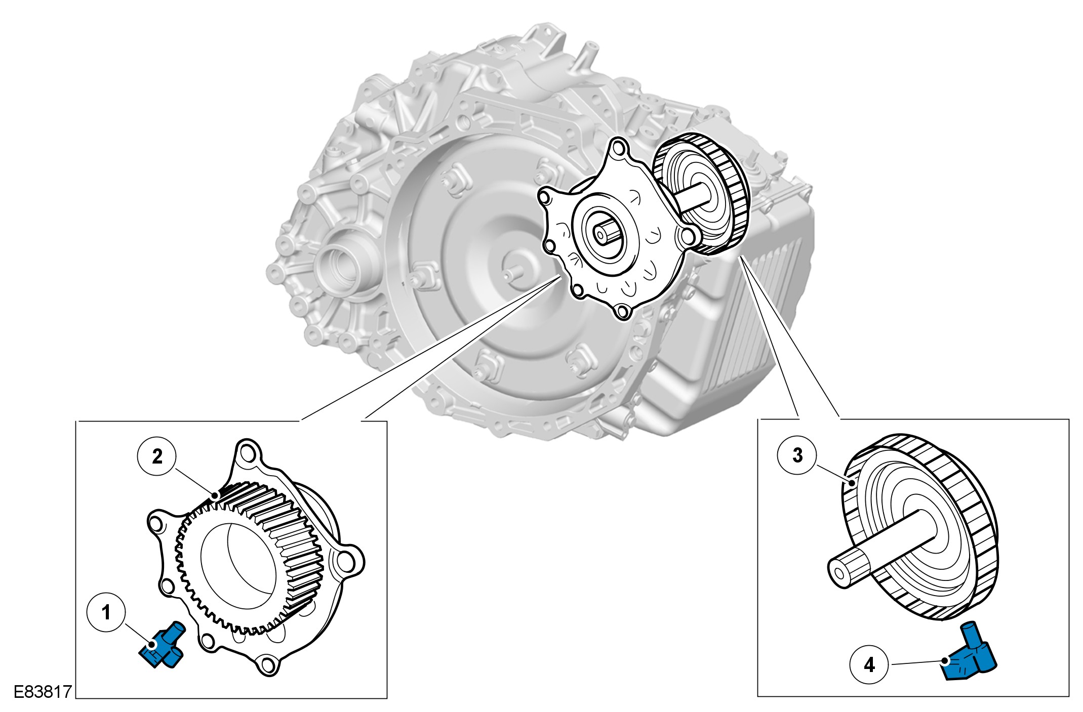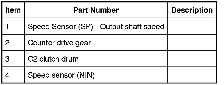 Two speed sensors (NIN and SP) are used in the transmission and are located within the transmission housing. Speed sensor (SP) is located adjacent to the counter drive gear and reads from the gear teeth to provide an output shaft speed signal. Speed sensor (NIN) is located adjacent to the clutch C" drum and reads off teeth on the outer circumference of the drum to provide an input shaft speed. Both speed signals are received by the TCM (transmission control module) which uses the 2 signals to calculate engine torque output, shift timing and torque converter lock-up.