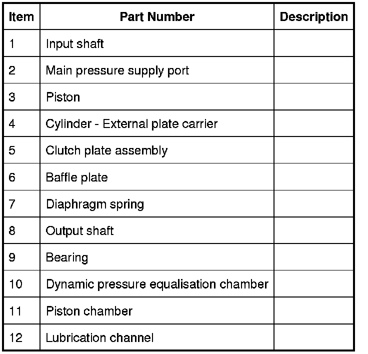 When clutch application is required, main pressure from the fluid pump is applied to the piston chamber from the supply port. This main pressure overcomes the low pressure fluid present in the dynamic pressure equalization chamber. The piston moves, against the pressure applied by the diaphragm spring, and compresses the clutch plate assembly. When the main pressure falls, the diaphragm spring pushes the piston away from the clutch plate assembly, disengaging the clutch.
