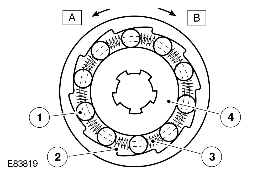 The roller clutch used on the one-way clutch uses parallel rollers, located between the smooth, cylindrical inner race and the inclined cam faces of the clutch body. Springs are used to hold the rollers in position between the two contact faces.