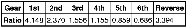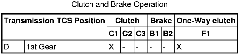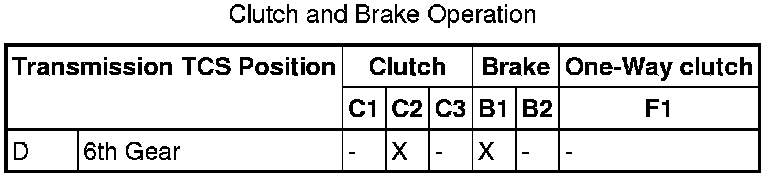 Engine torque is transferred, via operation of single or combinations of clutches to the two planetary gear trains. Both gear trains are controlled by reactionary inputs from brake clutches to produce the six forward gears and one reverse gear. The ratios are as follows:
