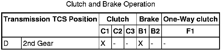 When the engine brake is active, driving force is transmitted to the transmission from the road wheels, via the power transfer unit. The rear planetary carrier is locked from clockwise rotation by the one-way clutch (F1) and brake (B2). This results in torque from the wheels being transmitted directly to the engine, providing engine braking.