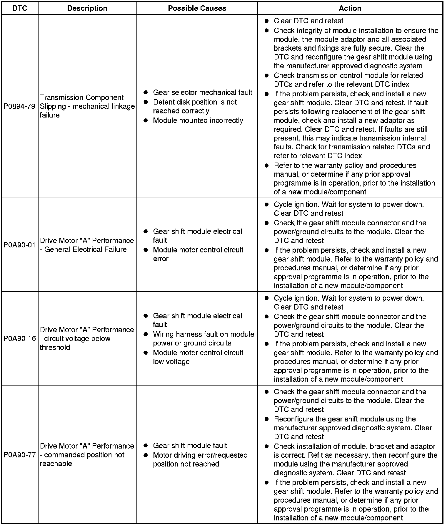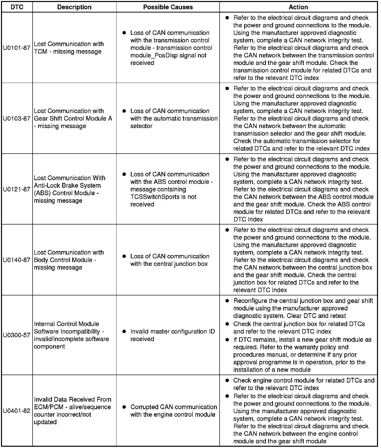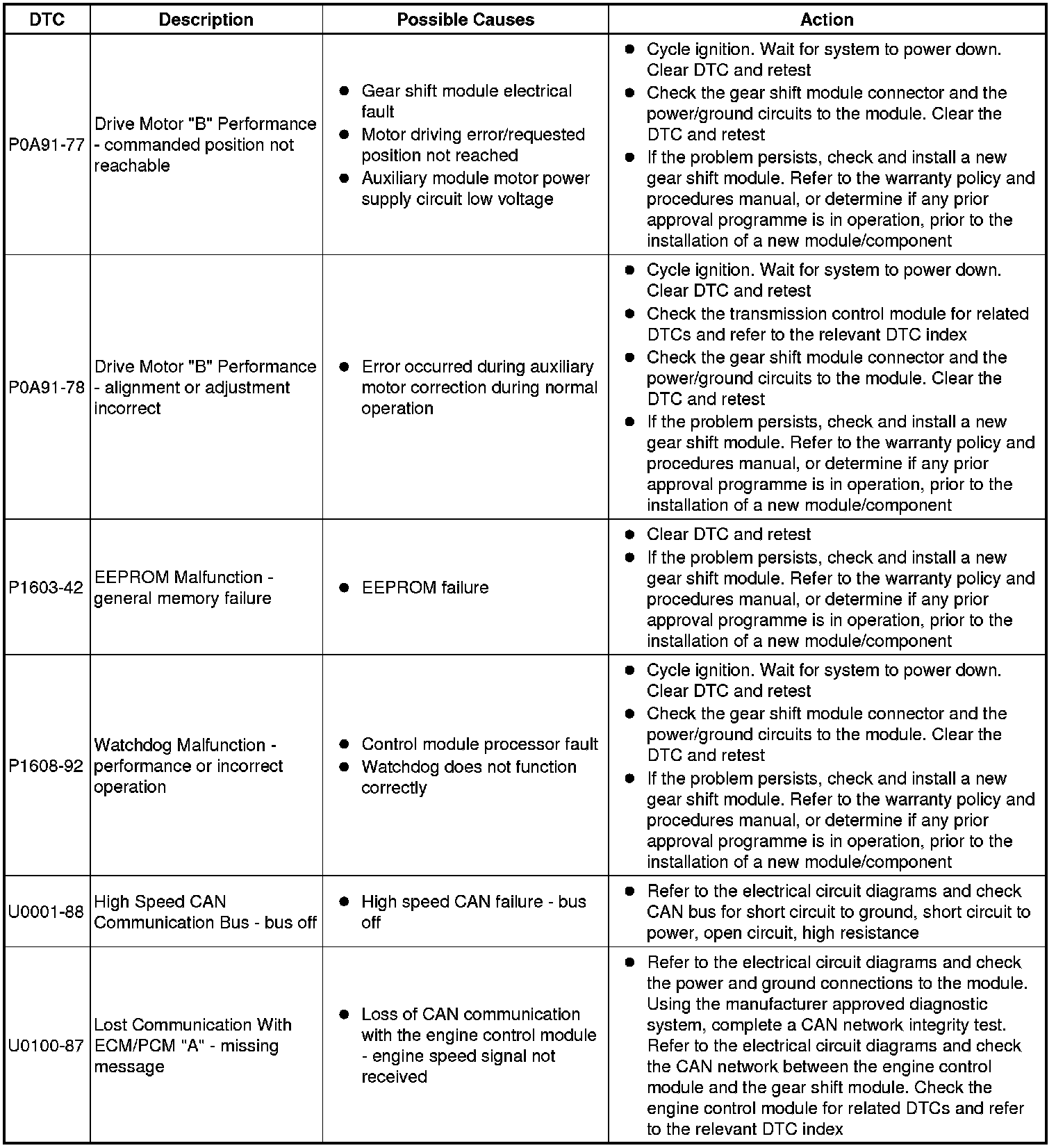 The table below lists all diagnostic trouble codes (DTCs) that could be logged in the gear shift module, for additional information refer to the relevant Description and Operation section. For additional information, refer to External Controls Component Locations