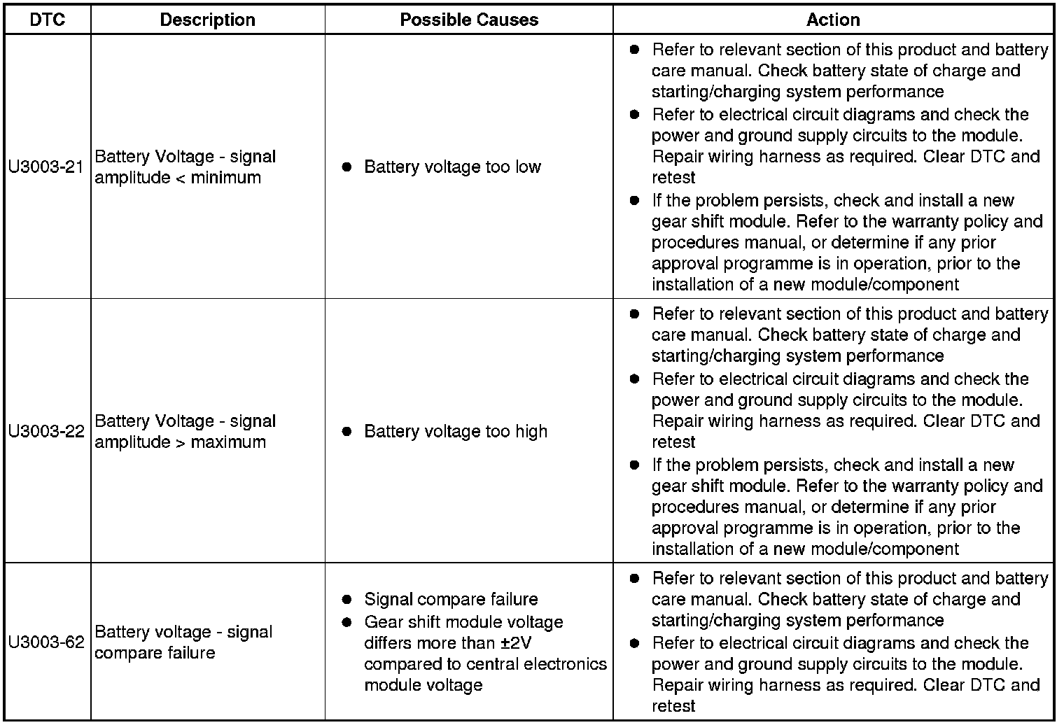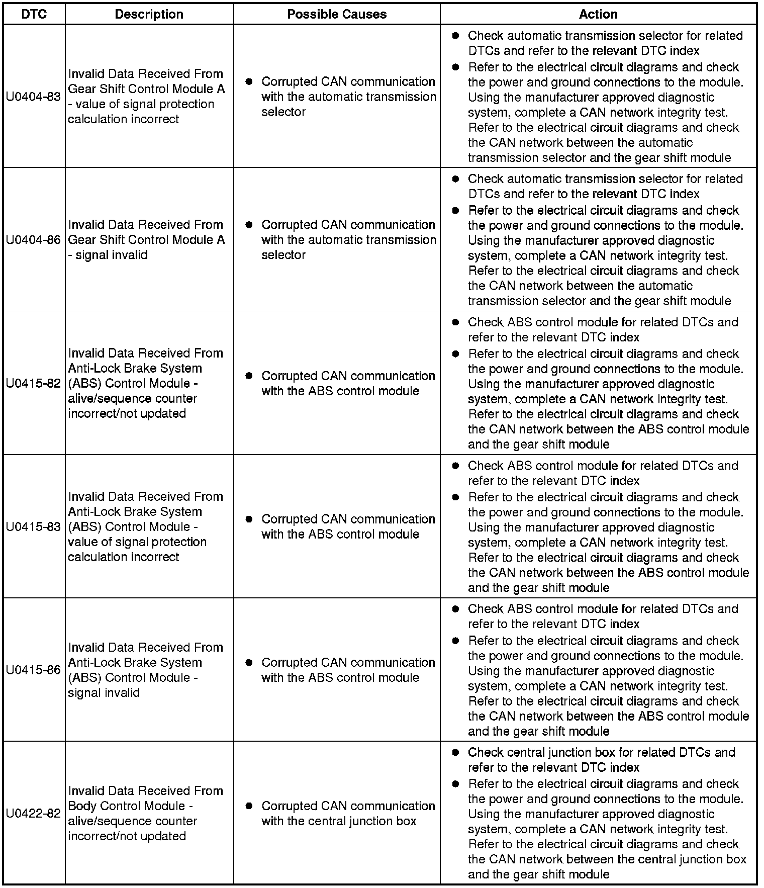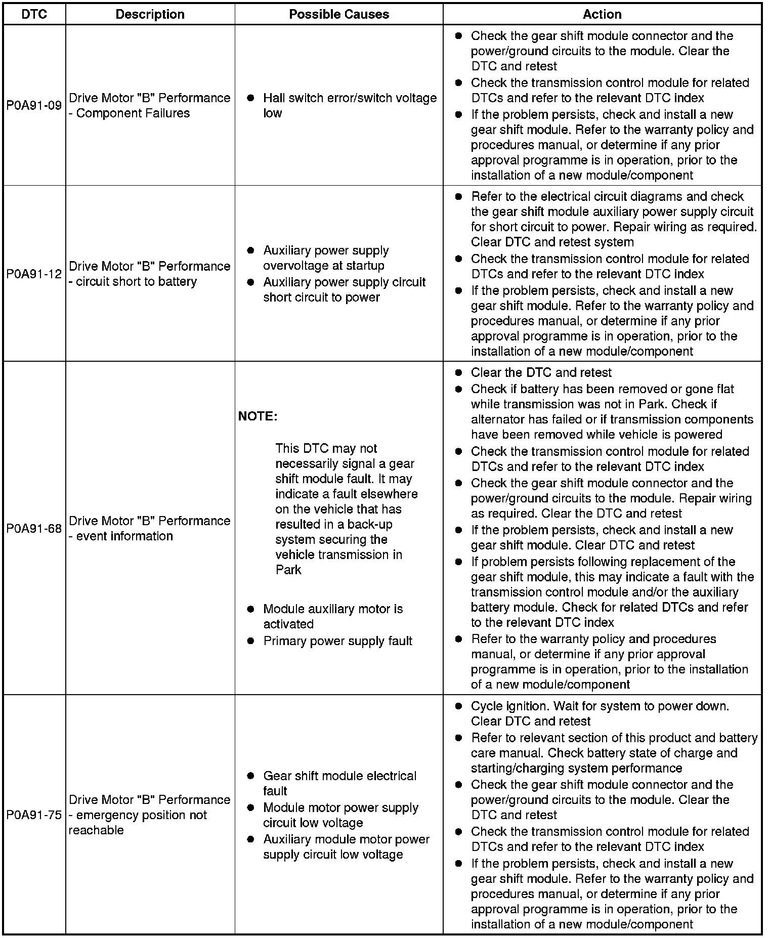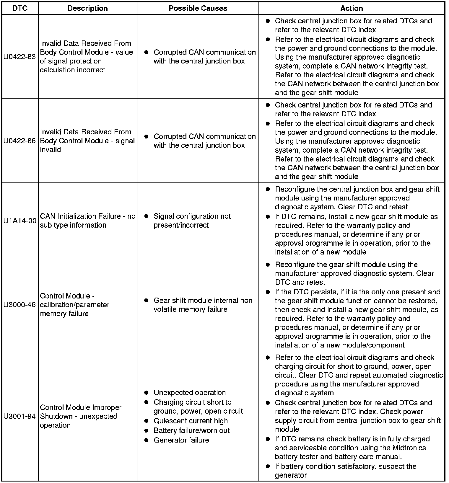 The table below lists all diagnostic trouble codes (DTCs) that could be logged in the gear shift module, for additional information refer to the relevant Description and Operation section. For additional information, refer to External Controls Component Locations