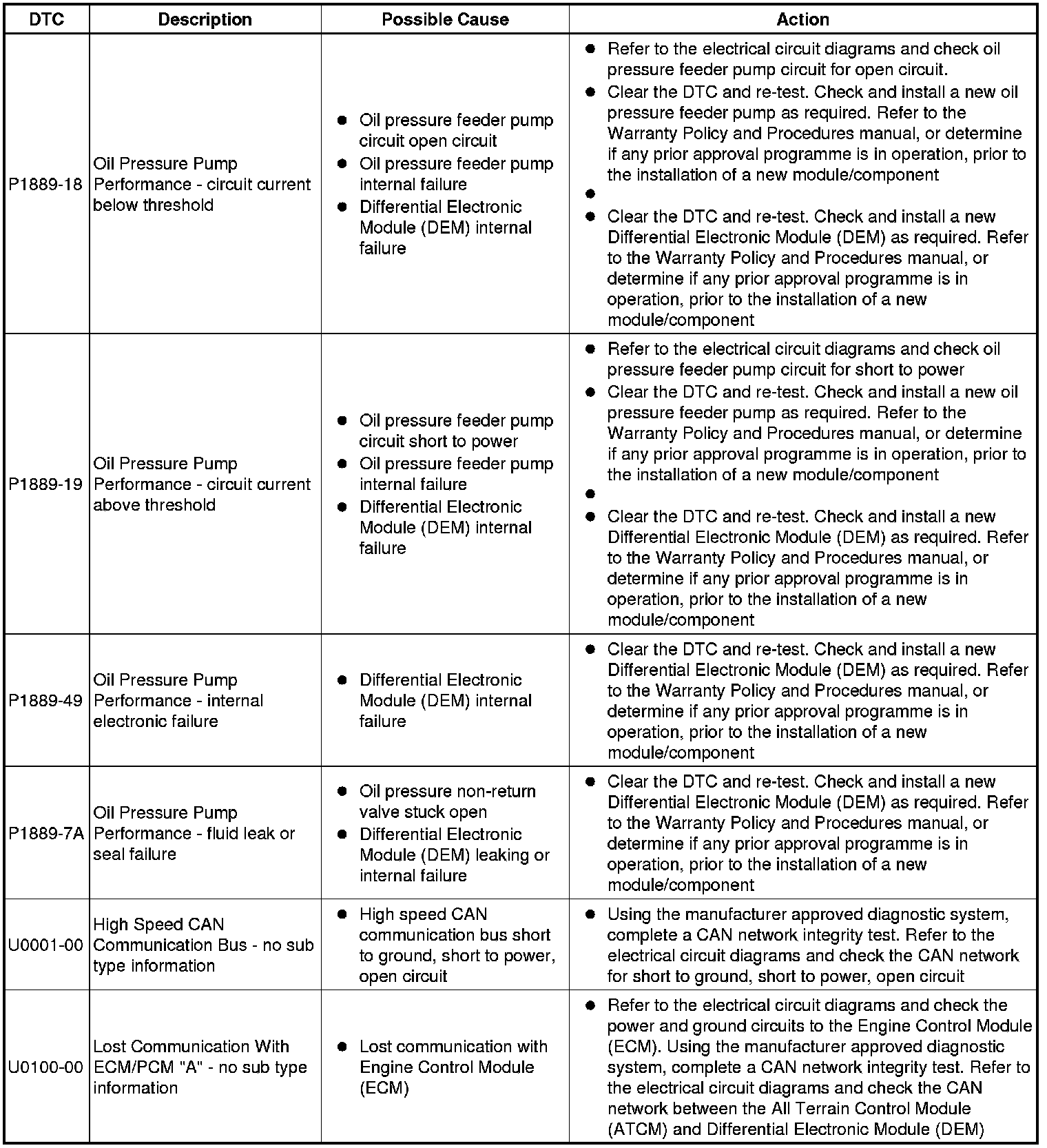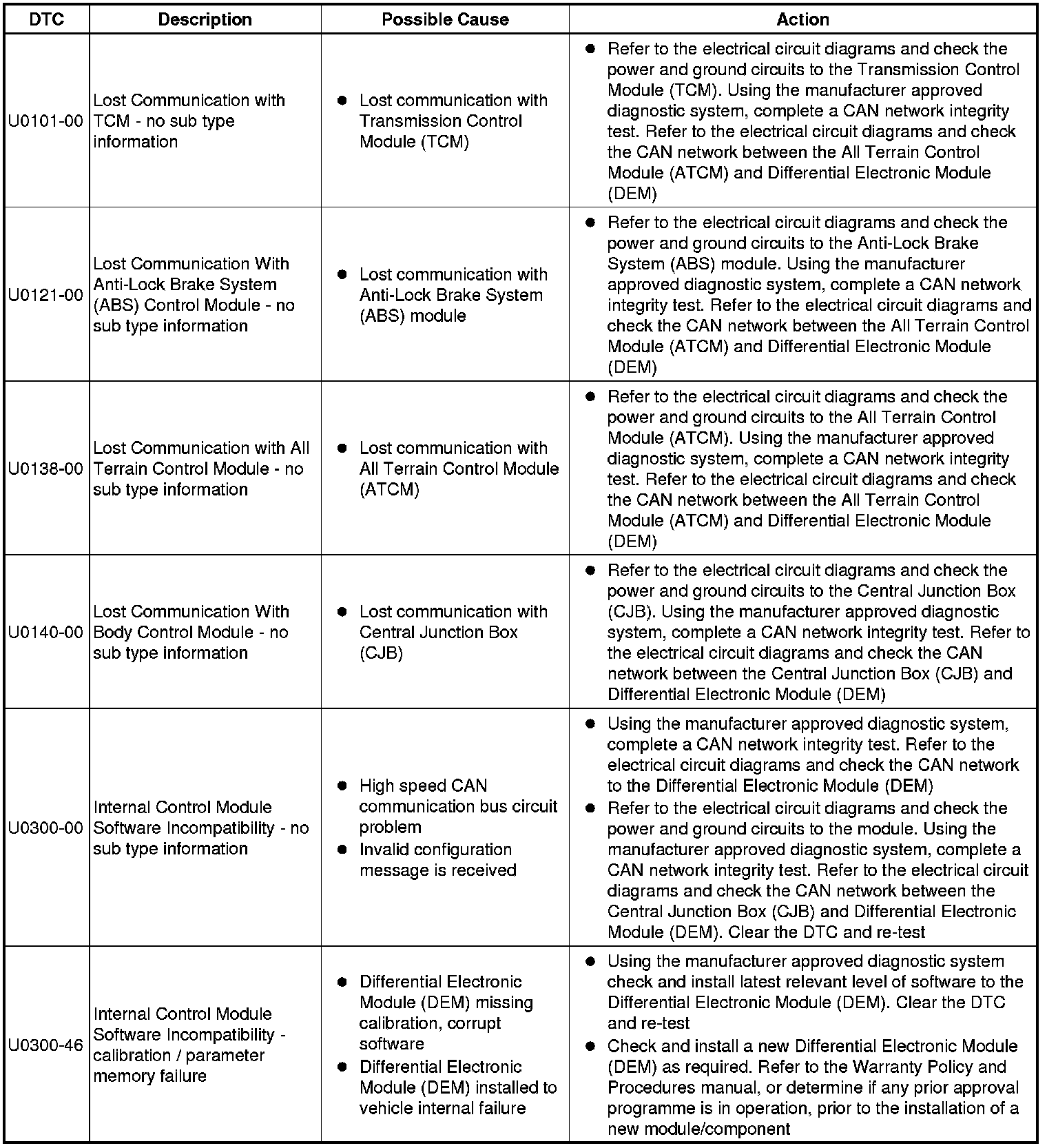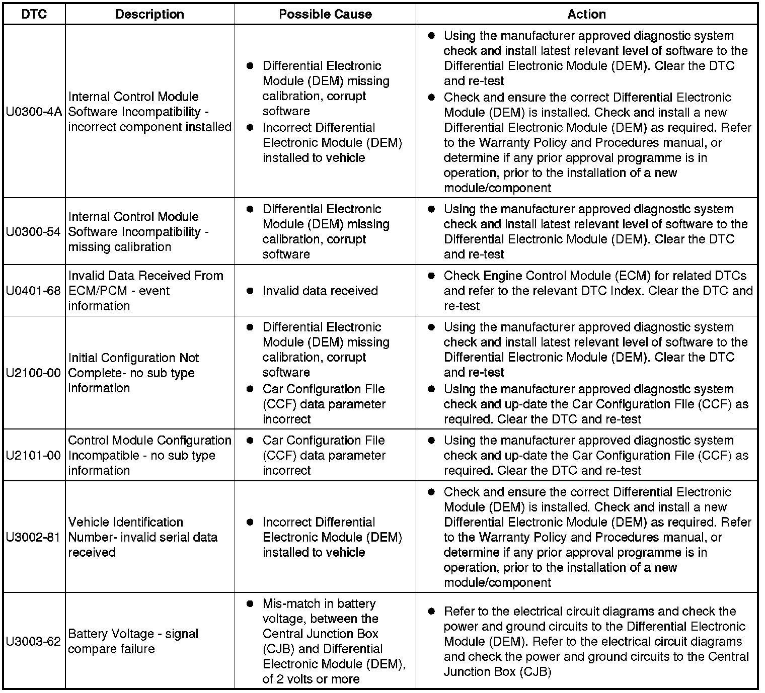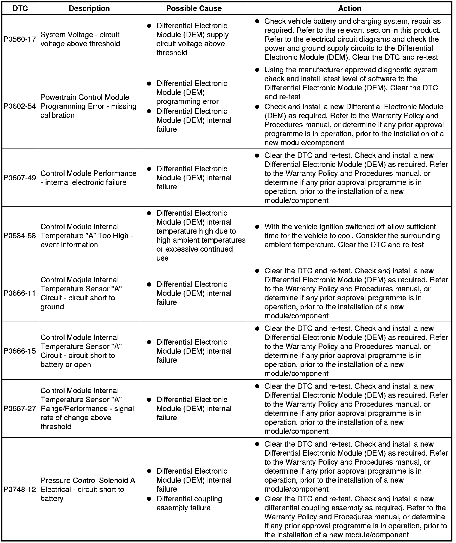 The table below lists all Diagnostic Trouble Codes (DTCs) that could be logged in the rear differential control module, for additional Diagnosis and Testing information refer to the relevant Diagnosis and Testing Section. For additional information, refer to Rear Drive Axle and Differential Testing and Inspection