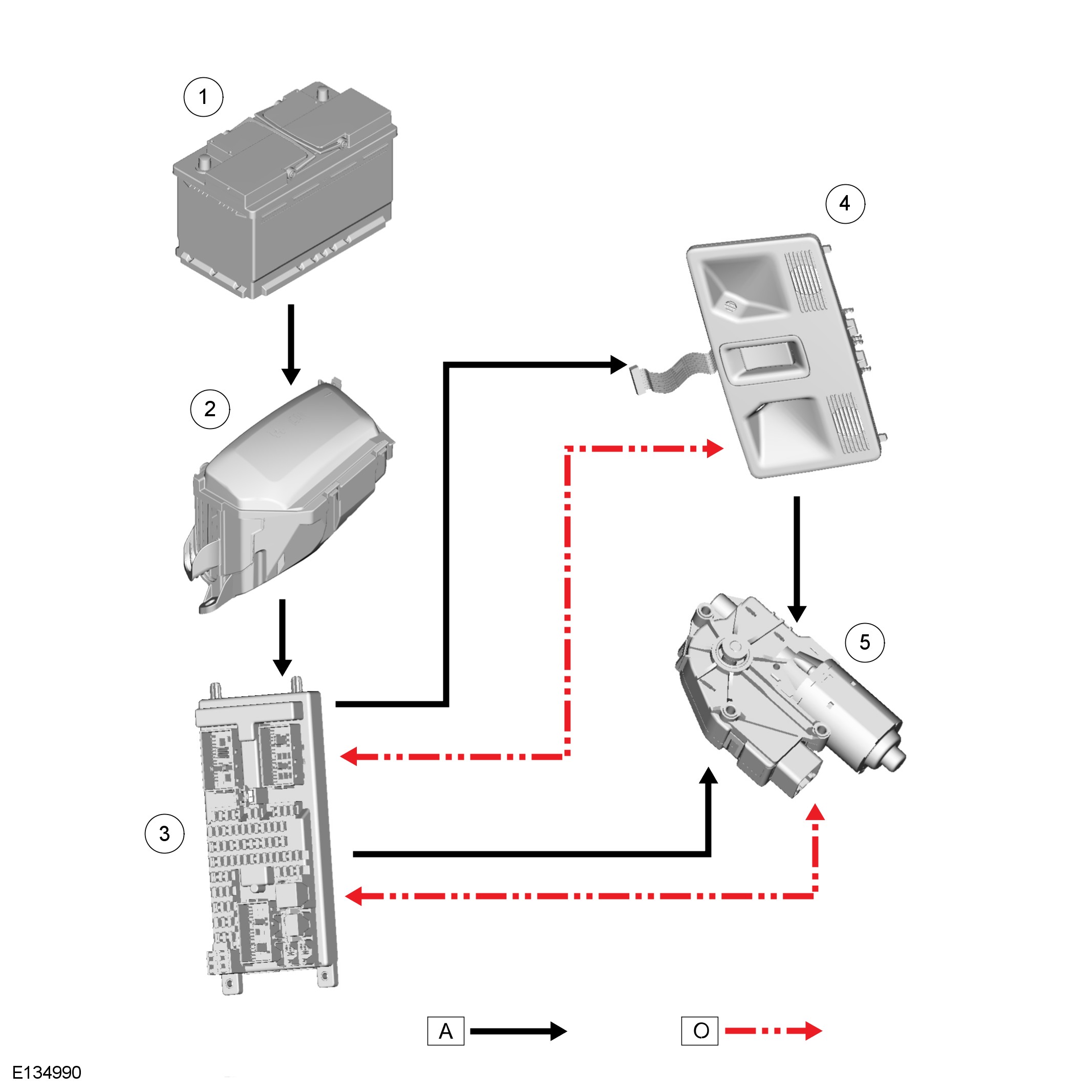 The roller blind will only operate when the vehicle is in power mode 6 (ignition on). Power is supplied to the roller blind control unit/motor by the BCM, which supplies both a permanent battery and ignition power supply.