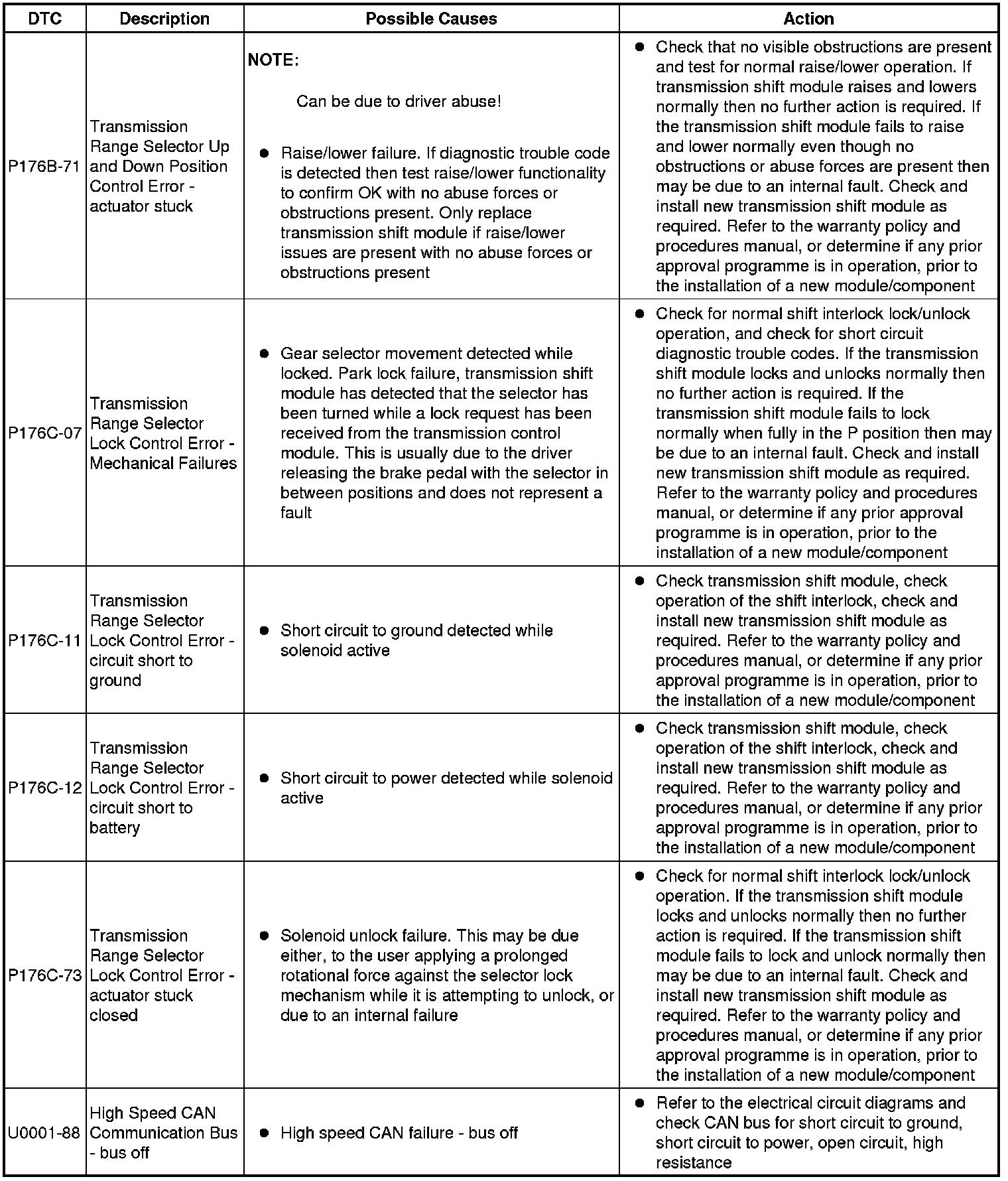 The table below lists all diagnostic trouble codes (DTCs) that could be logged in the gear shift module, for additional diagnosis and testing information refer to the relevant diagnosis and testing section For additional information, refer to External Controls Initial Inspection and Diagnostic Overview