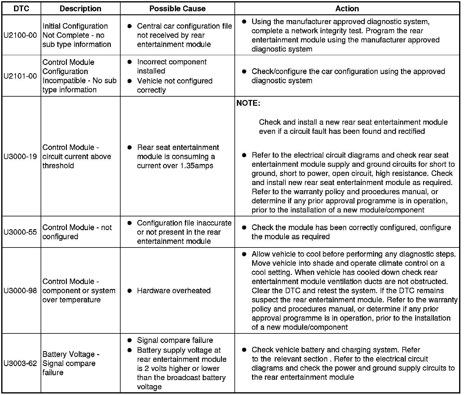 The table below lists all Diagnostic Trouble Codes (DTCs) that could be logged in the Rear Entertainment Module, for additional Diagnosis and Testing information refer to the relevant Diagnosis and Testing Section. For additional information, refer to Information and Entertainment System Initial Inspection and Diagnostic Overview