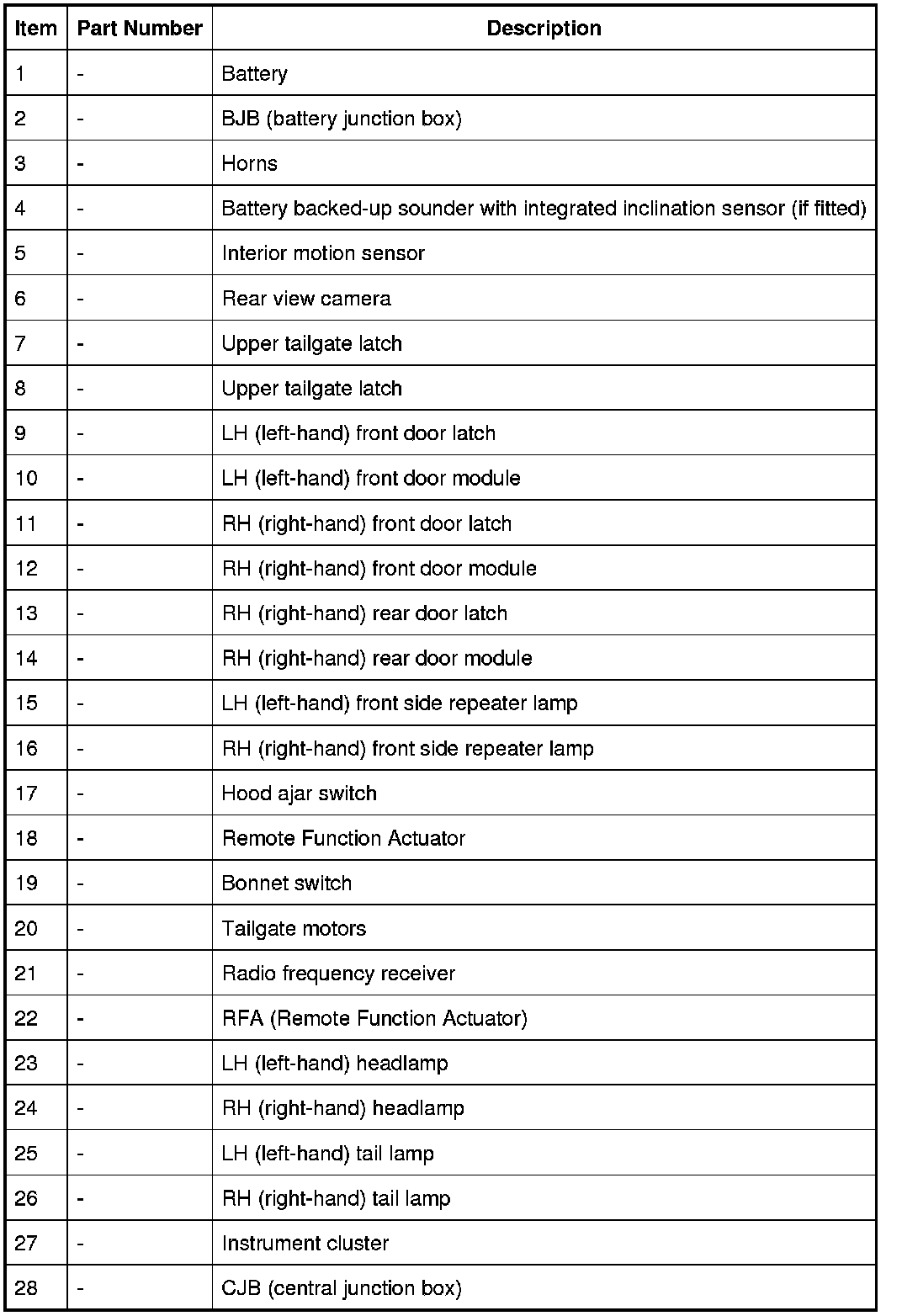 Monitoring of the hinged panels is carried out using switches located in each door latch assembly, the hood latch assembly, and the tailgate latch assembly. The condition of the switches is monitored by the CJB (central junction box).
