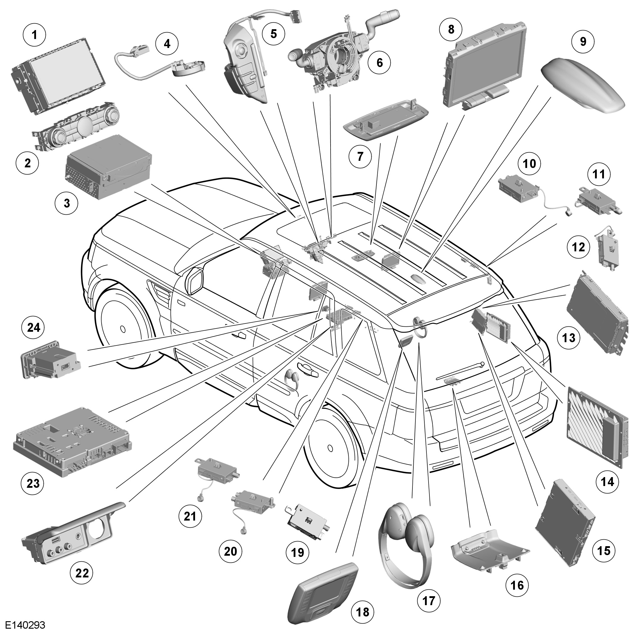 The remote control transmits an infra-red digital signal in response to operation of a button or soft key. The infra-red signal is received by a sensor located on each of the RSE rear screens. The remote control also allows selection of an auxiliary input from the AVIO panel (video or games console) or selection of audio (radio or CD).