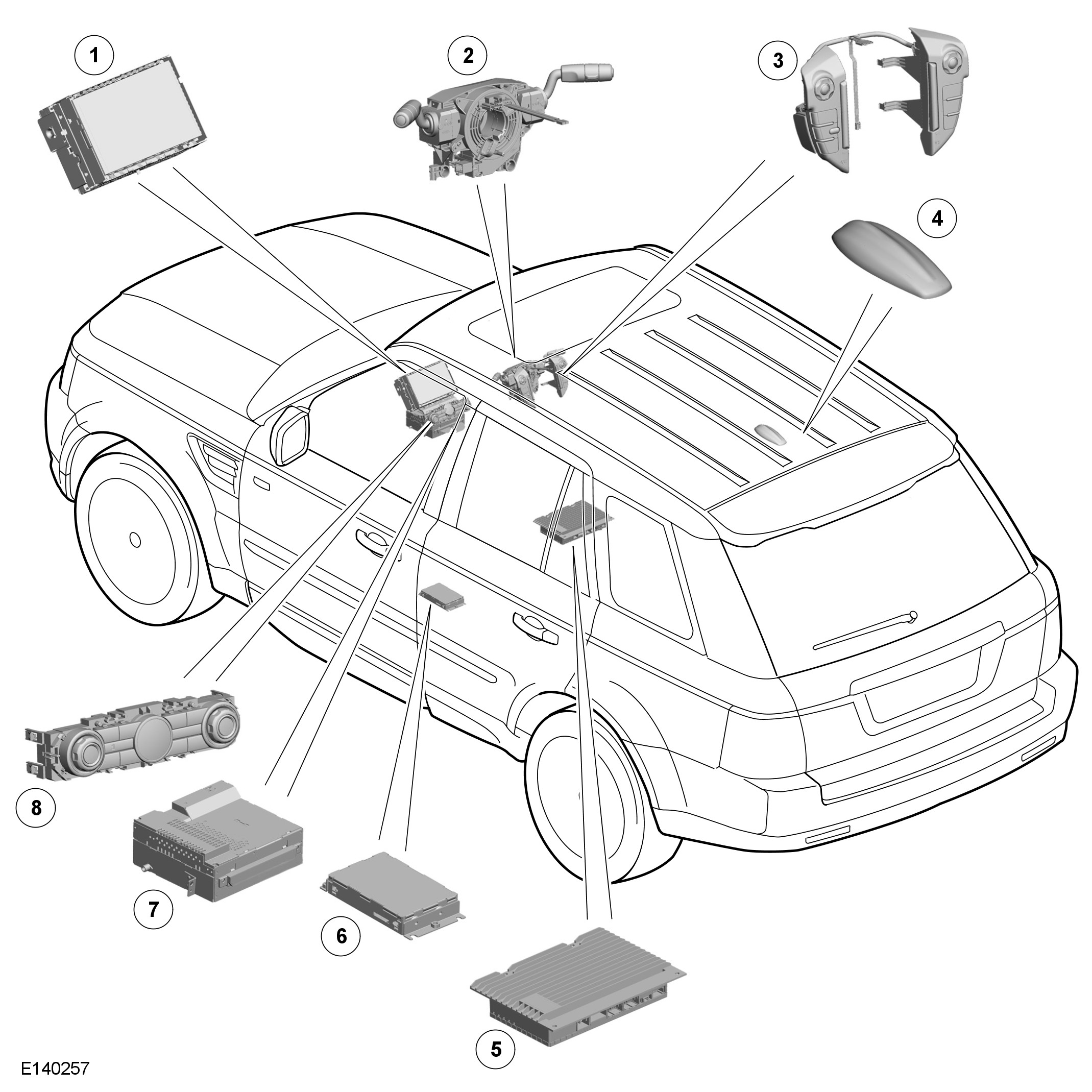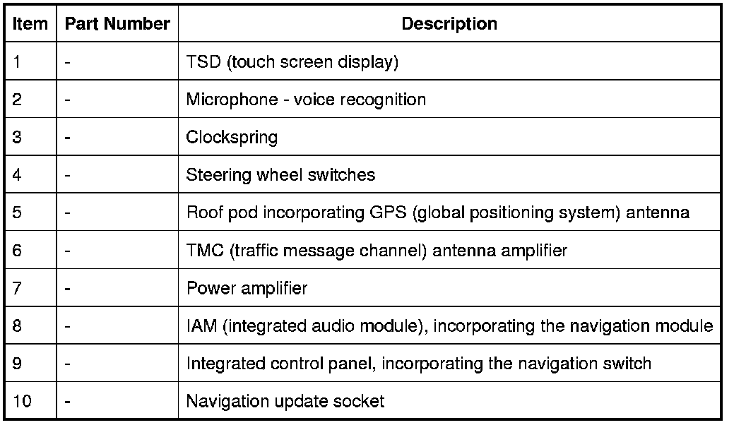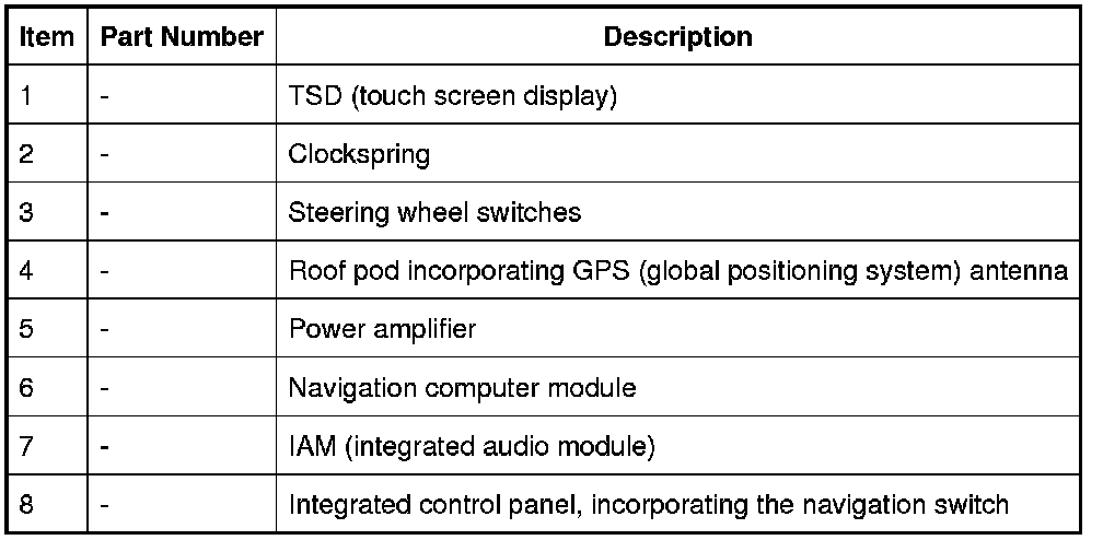 The navigation system is integrated with the audio/video system and shares a number of components common to all systems. Map information is stored on a hard disk drive located in the IAM (Integrated Audio Module). Map uploads to the hard drive can be uploaded by the customer from a USB (universal serial bus) memory stick (not applicable to Japan/Asia specification vehicles).