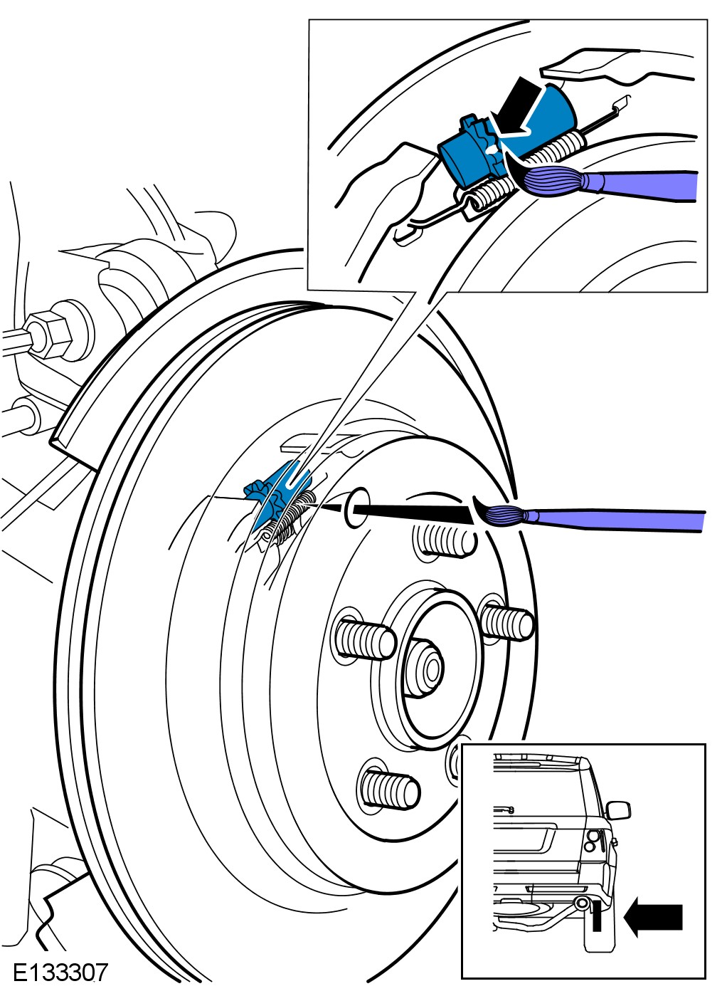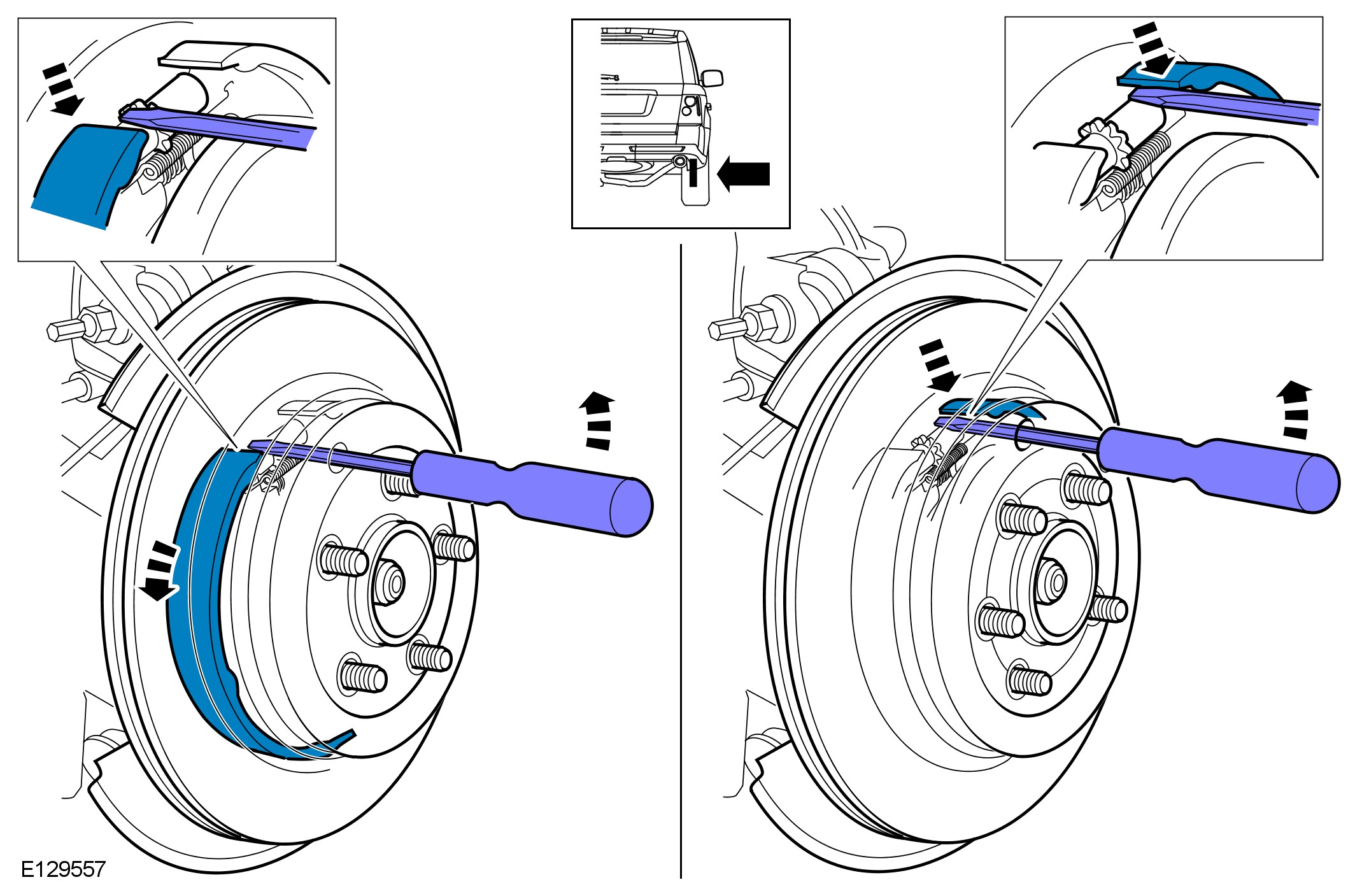 CAUTION: Failure to follow this step may cause damage to the parking brake system. Failure to displace the parking brake shoes, as shown, will result in incorrect clearance when carrying out the adjustment step.