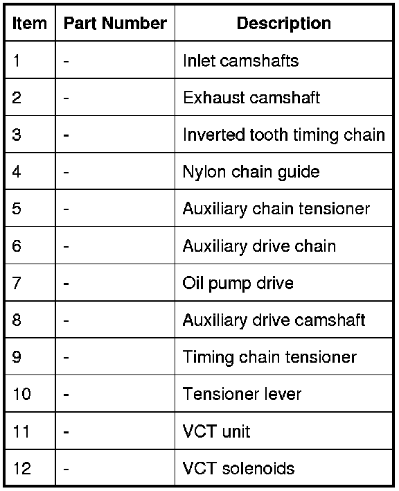 Double overhead camshafts on each cylinder head operate the valves. For each cylinder head, an inverted tooth timing chain transfers drive from the crankshaft to the VCT (variable camshaft timing) unit on the front of each camshaft. Graded tappets enable setting of inlet and exhaust valve clearances.