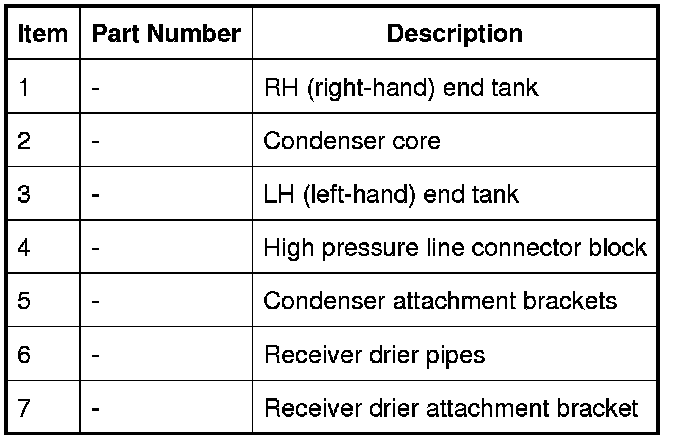 The condenser transfers heat from the refrigerant to the surrounding air to convert the vapor from the A/C (air conditioning) compressor into a liquid. A receiver drier module, integrated onto the LH (left-hand) side of the condenser, incorporates a filter and a desiccant to remove solid impurities and moisture from the refrigerant. The receiver drier module also functions as a reservoir for liquid refrigerant, to accommodate changes of heat load at the evaporator.