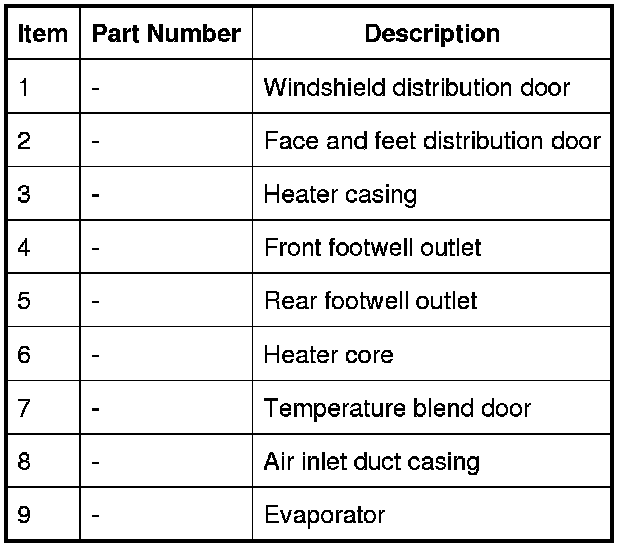 The heater controls the temperature of the air supplied to the distribution ducts, as directed by the ATC (automatic temperature control) module. The heater is installed on the vehicle center-line, between the instrument panel and the engine bulkhead. The heater consists of a casing, formed from plastic moldings, which contains an evaporator, heater core and control doors. Internal passages integrated into the casing guide the air through the casing and separate it into two flows, one for the LH (left-hand) outlets and one for the RH (right-hand) outlets.