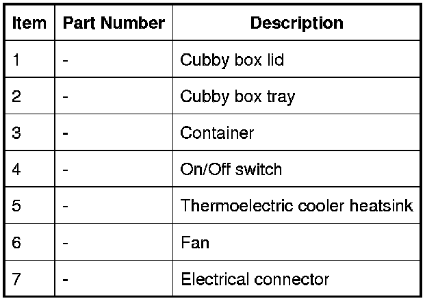 Operation of the thermoelectric cooler is controlled by an on/off switch on the top front edge of the container. A permanent battery feed is supplied to the on/off switch from the central junction box (CJB). A light emitting diode (LED) in the on/off switch is illuminated while the cool box is selected on.