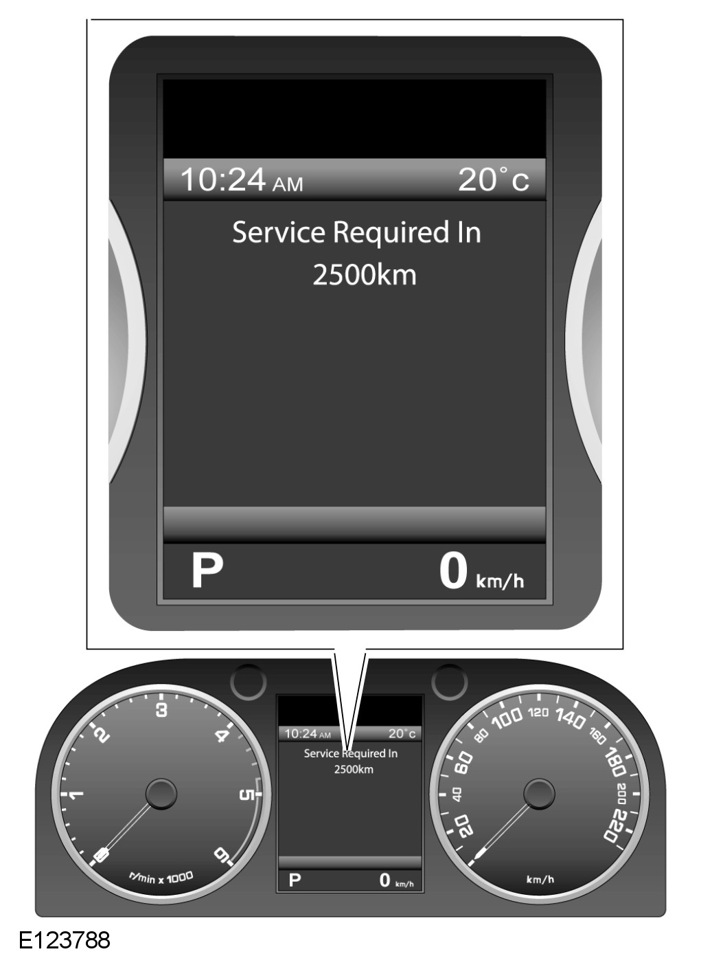The service information is displayed in the message center for 4 seconds at each ignition cycle. There is no minus figure if the service distance is exceeded, 'Service Required' is displayed until the ECM service counter is reset using an approved diagnostic system.