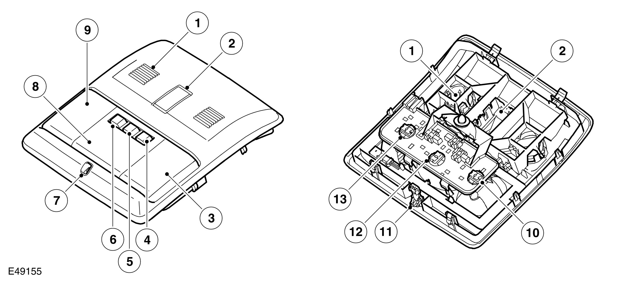 The main interior lamp is located in a housing which can also contain the sunroof switch and/or the voice activation microphones, depending on specification.