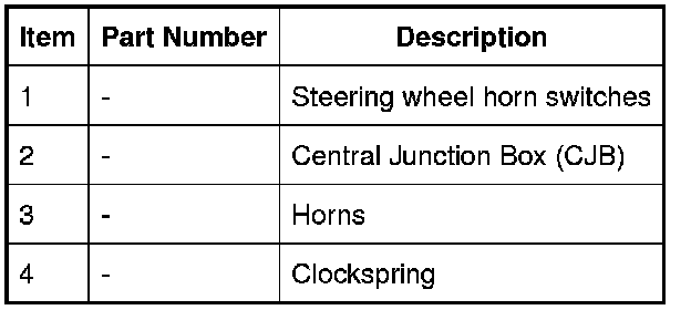 The horns are also used by the vehicle alarm system. When the alarm system requires the horns to operate, the Central Junction Box (CJB) provides a ground, closing the relay contact which in turn supplies battery voltage to operate the horns. For additional information, refer to Anti-Theft - Active Anti-Theft - Active