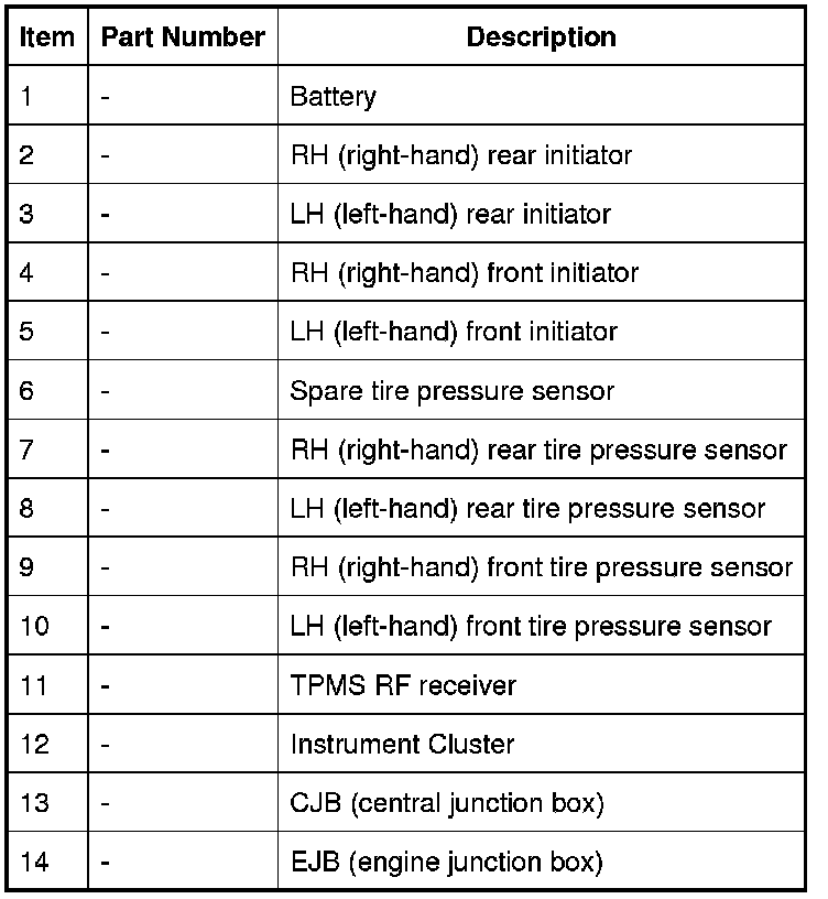 Each time the vehicle is driven, the CJB (central junction box) transmits a Low Frequency (LF) (125 KHz) signal to each initiator in turn. This is received by the tire pressure sensor which transmits a Radio Frequency (RF) (315 or 433 MHz depending on market) signal to the RF receiver. This signal contains coded data which corresponds to sensor identification, air pressure, air temperature and acceleration data. This signal is communicated to the CJB (central junction box) via a K-bus line.