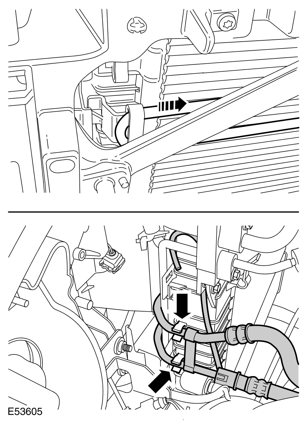 6 Release the LH radiator air deflector lower clip, position the deflector aside.