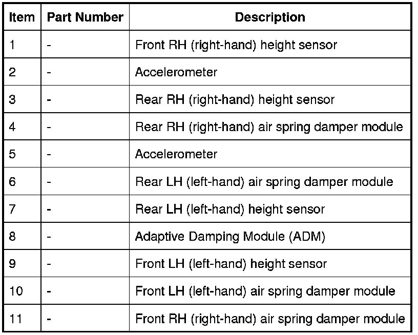 A calibration routine is performed using the Land Rover approved diagnostic system to read the position of each corner of the vehicle and record the settings in the control module memory. Once set, the calibration is not required to be performed unless the air suspension control module or adaptive damping module is removed or replaced, a height sensor is removed or replaced or a suspension arm to which the sensor is connected is removed or replaced. If the removed height sensor is subsequently refitted, the calibration procedure will have to be performed to ensure the integrity of the system.
