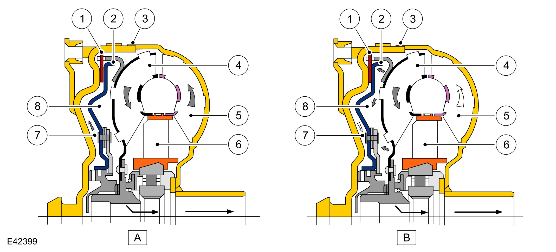 Fluid emitted from the impeller acts on the turbine. If the turbine is rotating at a slower speed than the fluid from the impeller, the fluid will be deflected by the turbine blades in the path 'A'. The fluid is directed at and deflected by the stator blades from path 'B' to path 'C'. This ensures that the fluid is directed back to the pump in the optimum direction. In this condition the sprag clutch is engaged and the force of the fluid on the stator blades assists the engine in rotating the impeller.