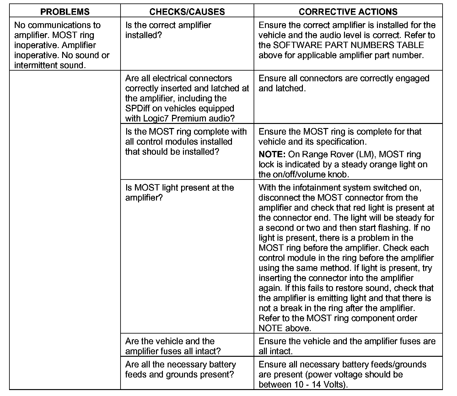A customer may report a concern of no sound or intermittent sound from the audio system. Investigation using diagnostic equipment reveals no communications to amplifier, the Media Orientation System Transport (MOST) ring is inoperative or the audio amplifier is inoperative. Various issues can lead to the reported concern.