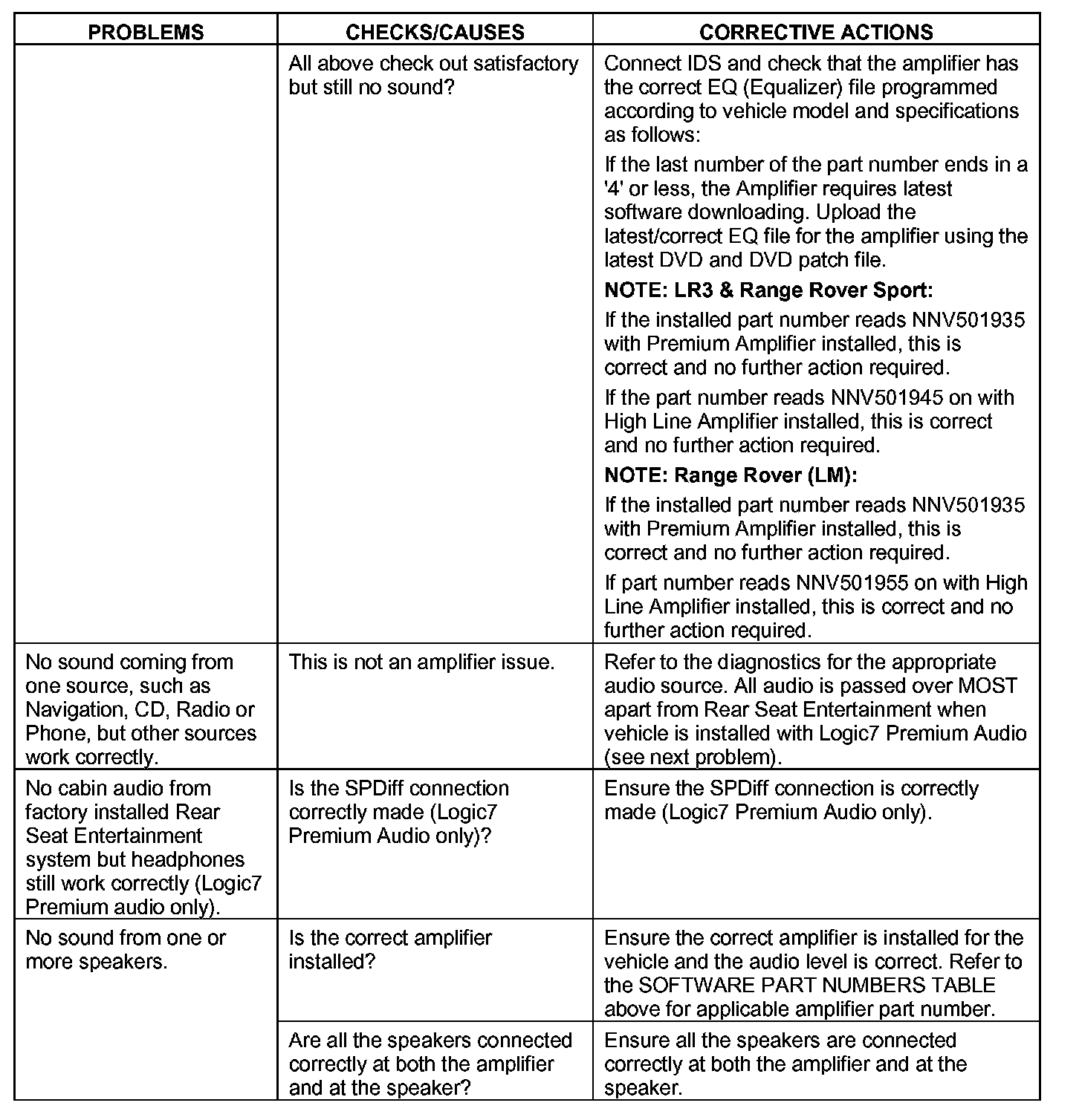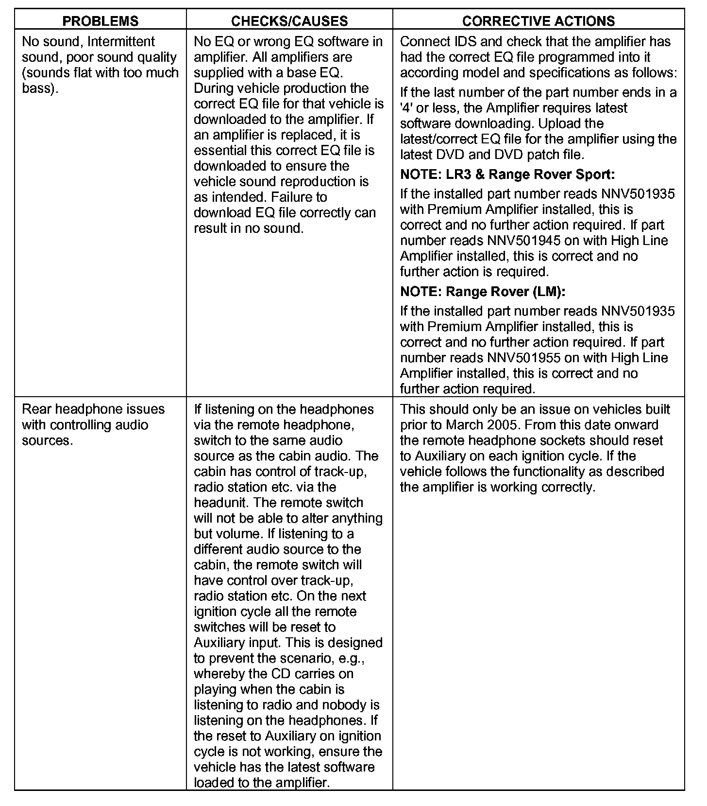 3. If CORRECTIVE ACTIONS do not rectify the problem, verify if the reported problem is rectified by installing a known working amplifier and that the reported problem returns when the suspect amplifier is reinstalled, before determining that the vehicle amplifier requires replacement.