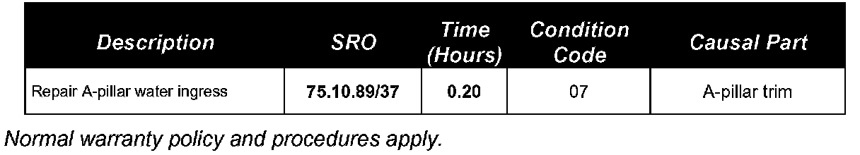 If water ingress is confirmed from the A-pillar region on either side of the vehicle, BOTH sides of the vehicle must be repaired at the same time. Follow the Repair Procedure in this bulletin to remove the lower location pegs from the A-pillar exterior trim, cover the lower pin attachment slots in the A-pillar and install the trim using new clips in the special hardware kit available for the repair.