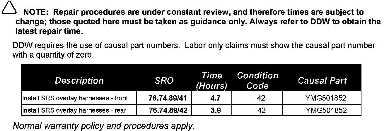In the event a DTC from the RCM indicates an SRS wiring fault, refer to the Workshop Manual Service Procedure detailed in this bulletin to identify and replace the problem harness section with the appropriate overlay repair harness.